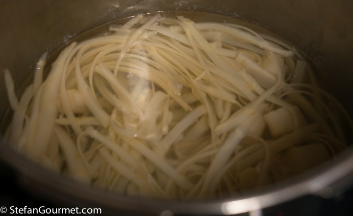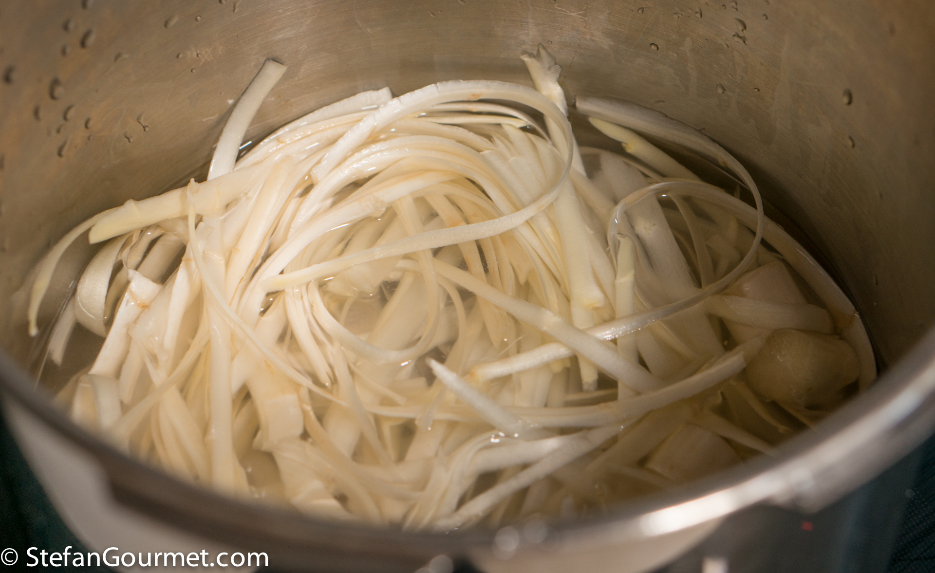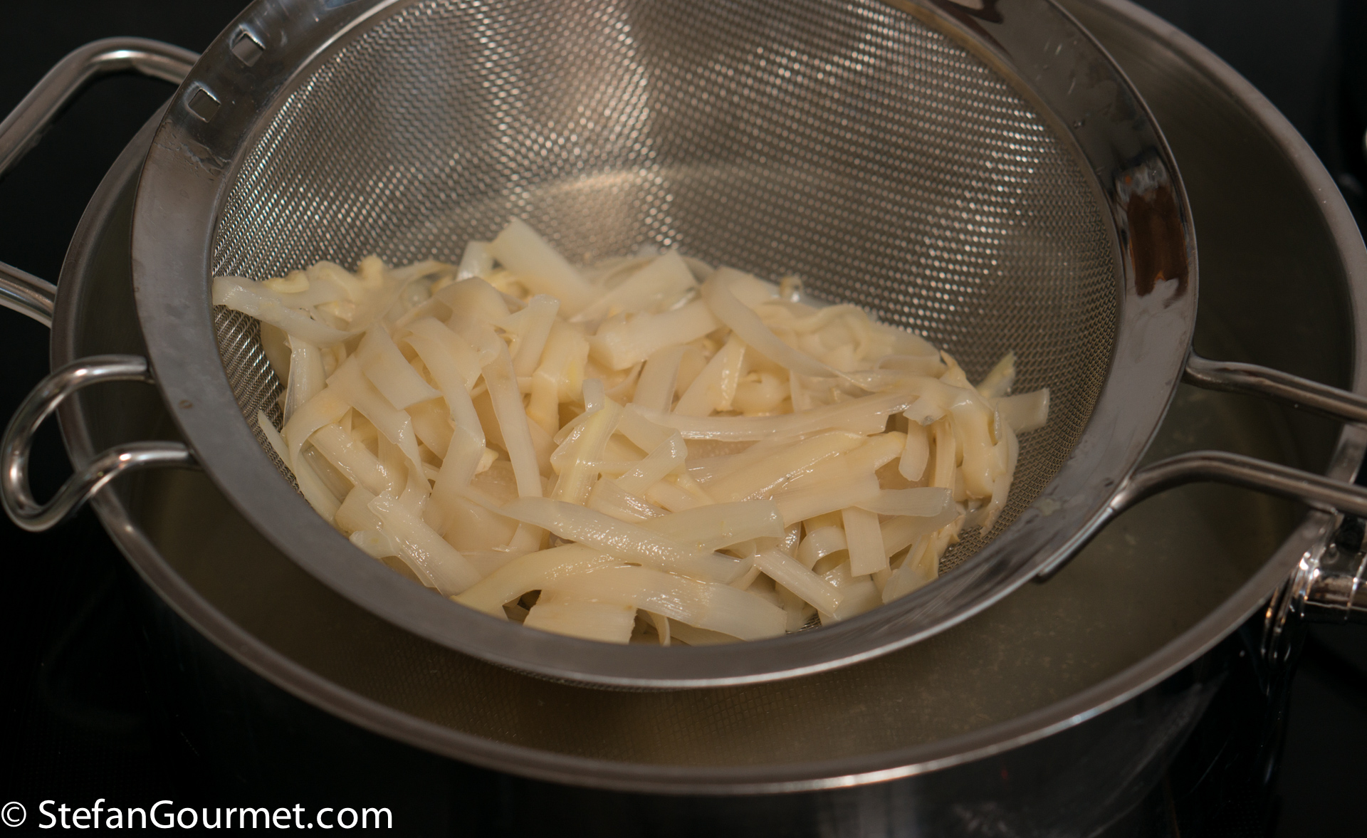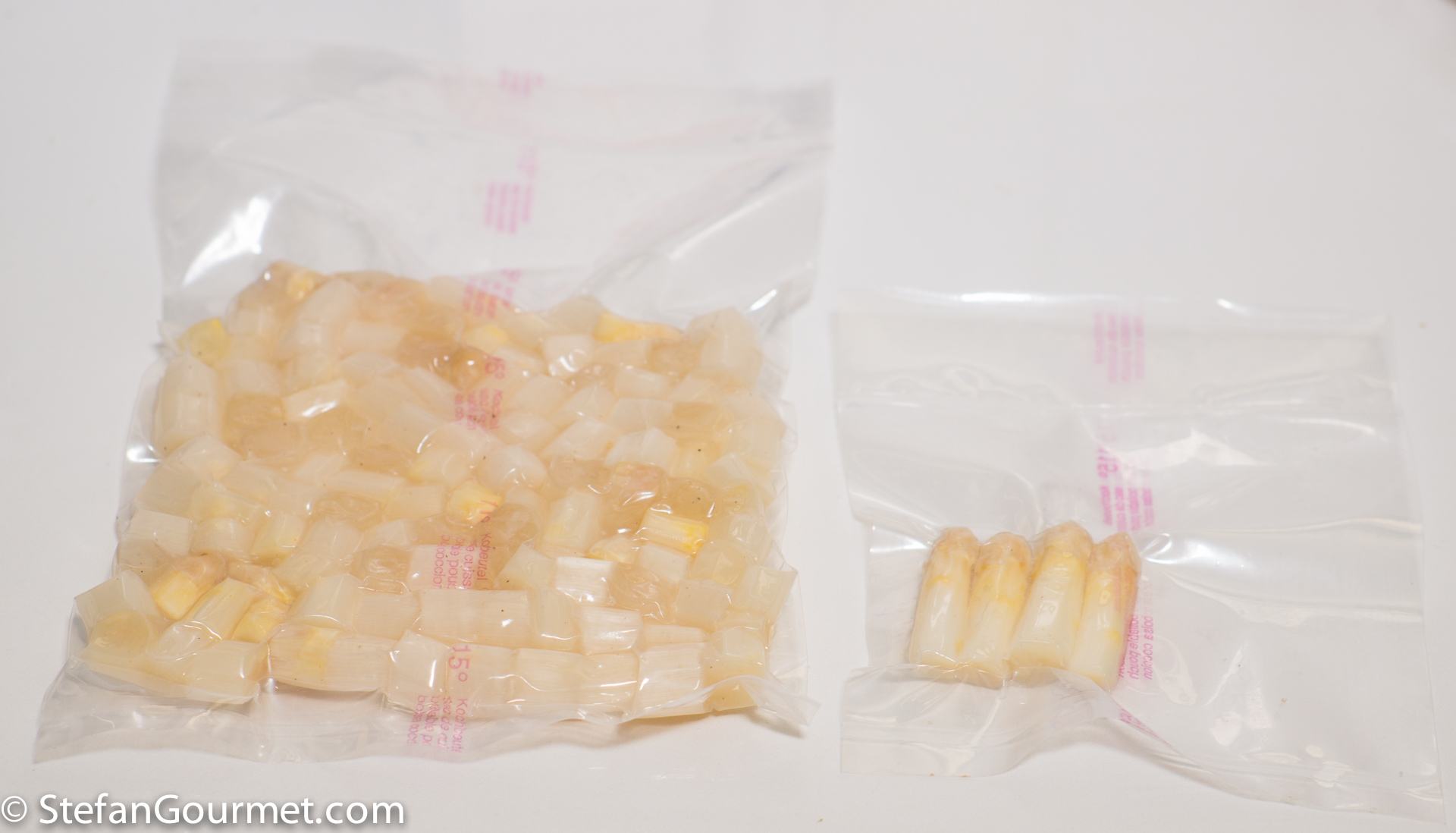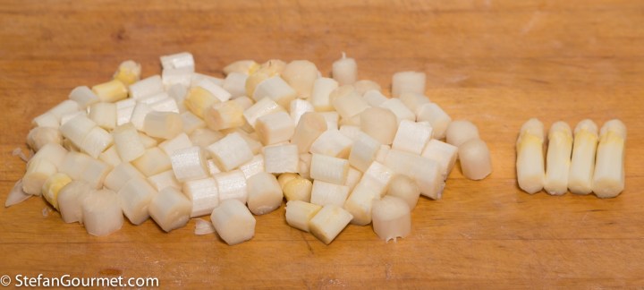 You could also make this with green asparagus, but the flavor and texture will not be as elegant and the color not as pretty. So use white asparagus if you can find them — which are actually the more easily available variety here during the asparagus season.