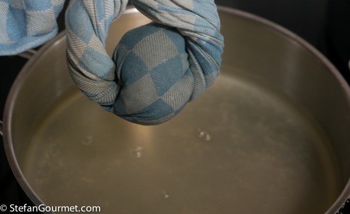 Using a clean dish cloth, squeeze out as much liquid from the asparagus trimmings and peels as you can, and add to the asparagus stock.
