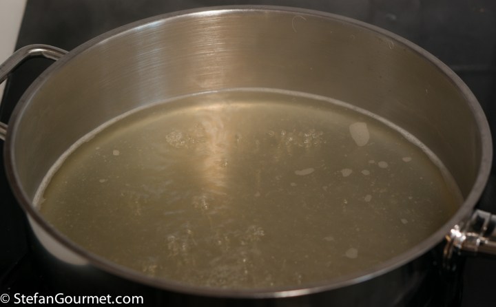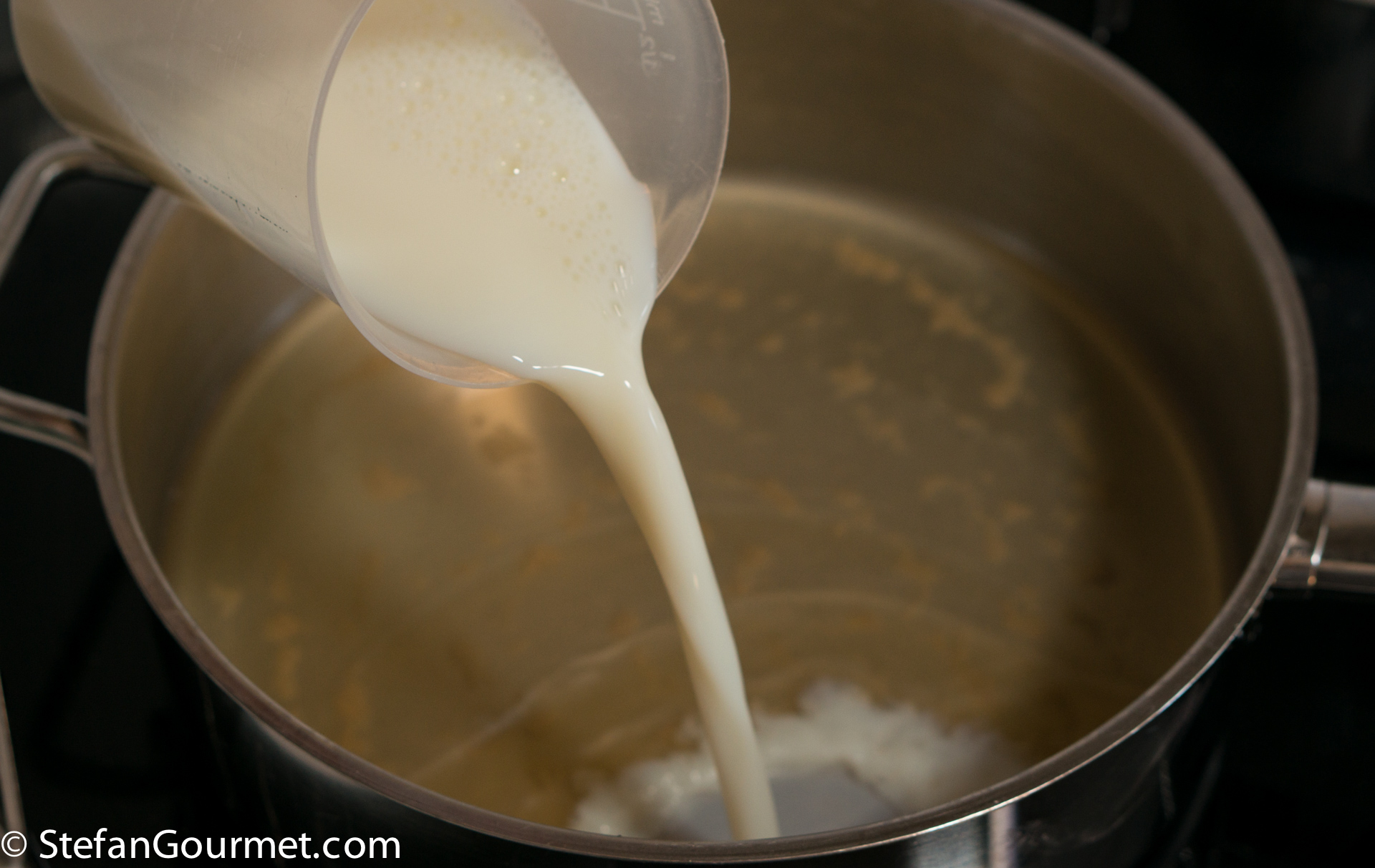 When the asparagus stock has been reduced to 250 ml (1 cup), add 250 ml (1 cup) milk, and heat it up (but do not allow it to boil).