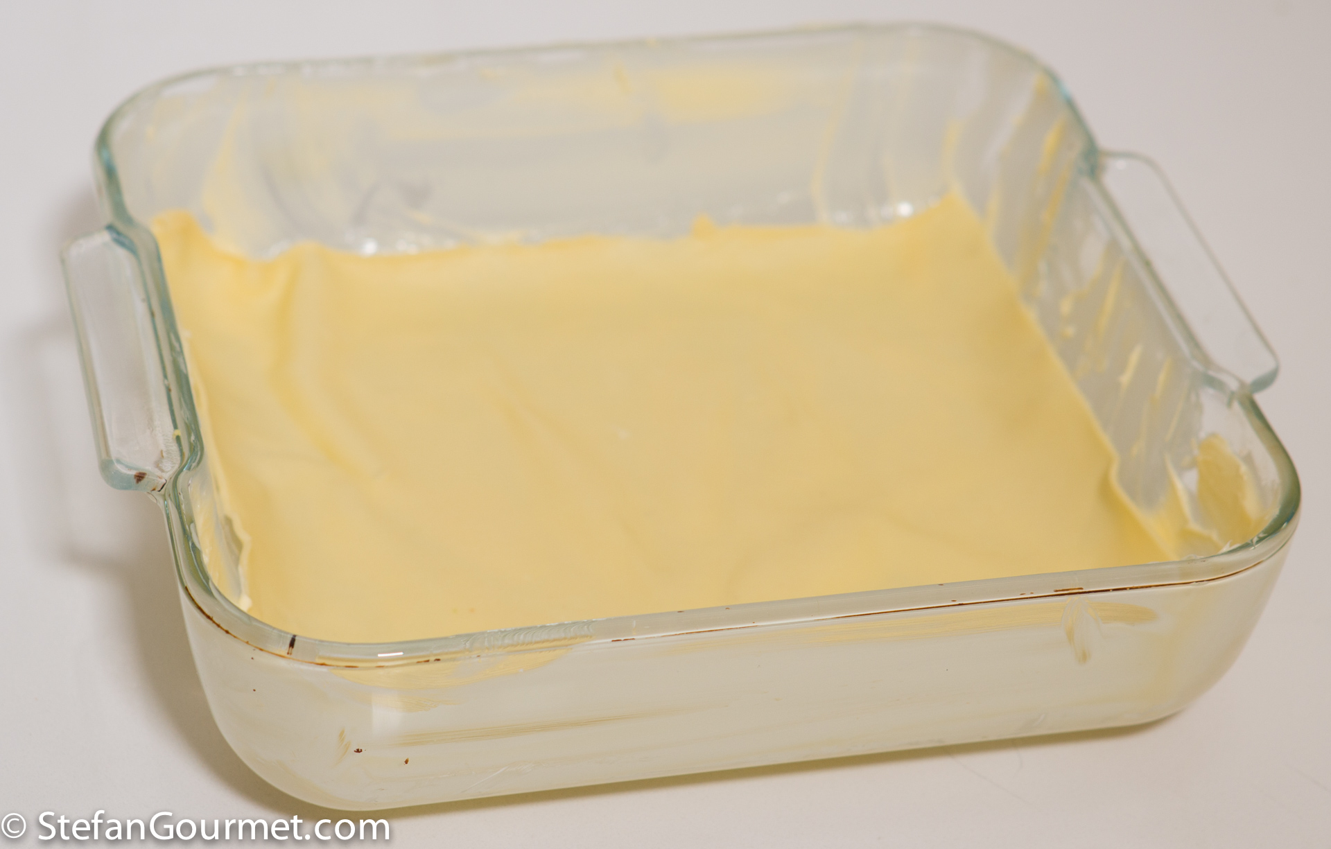 Trim the sheets such that they are the size of the dish. Put the first sheet in the bottom of the dish.
