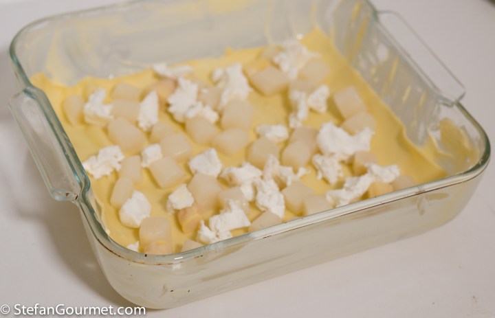 After the final sheet you should have 1/4 of the goat cheese and 1/4 of the white sauce left. Combine them and stir over low heat until the cheese has melted. Pour this mixture on top of the sheet…