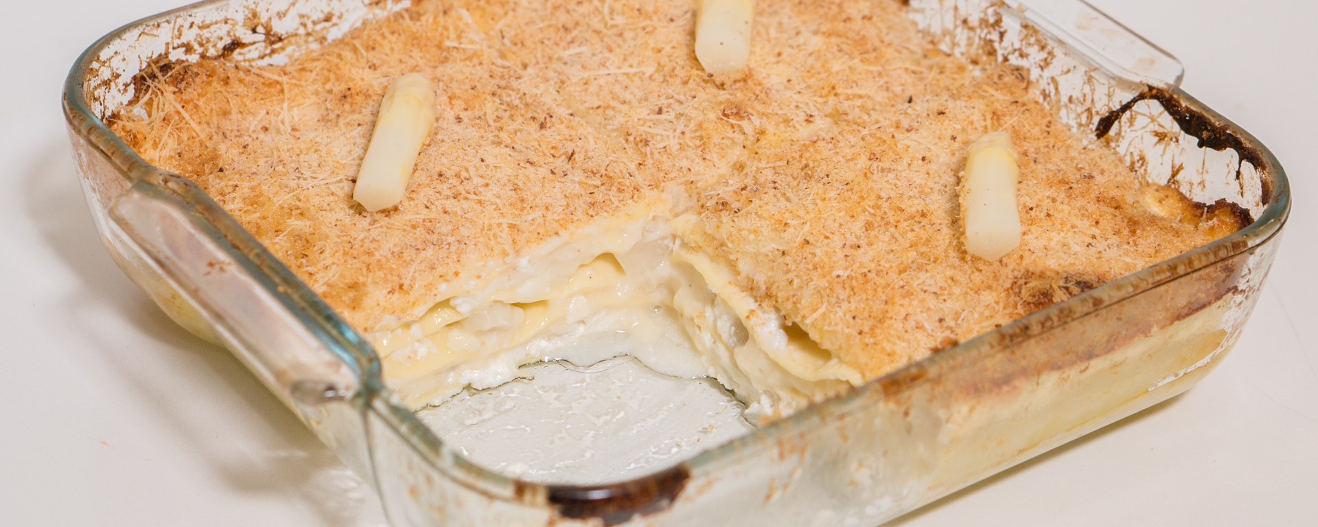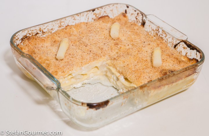 Happy Easter everyone! I thought this white asparagus lasagne was going to be good, but it turned out even better than I expected and I am most definitely making this again. The secret to this lasagne is that the white sauce is made from asparagus stock, thus boosting the asparagus flavor. With velvety pasta, tender yet crunchy asparagus, tangy goat cheese, luscious white sauce and a crispy top, what else is there to wish for?