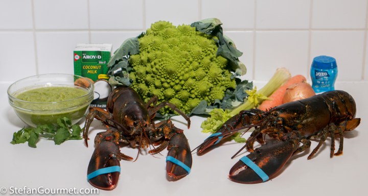 I cooked both the lobster and the romanesco sous-vide, but that is not required to get a good result. You could even use a lobster that is already cooked and frozen, as long as it comes in the shell so you can use the shells to make the bisque, but of course it will be more flavorful if you use live lobsters. If you can’t find romanesco, you could substitute with regular cauliflower. Homemade Thai green curry paste is much better than store-bought, but of course store-bought can be substituted.