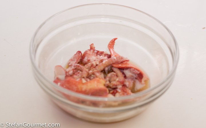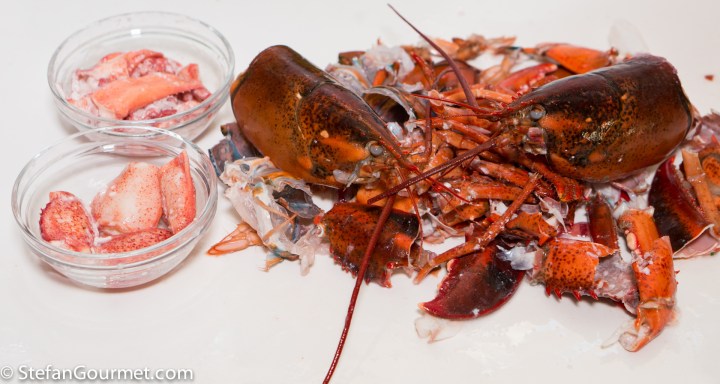 Get out all of the lobster meat. Keep the nice parts of the claws separate and combine the other meat (soft part of the claws, legs, and knuckles) in a bowl. Reserve the shells, but discard all the parts that will give a bitter flavor to the stock like the gills.