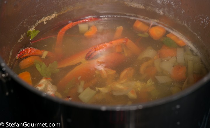 Add the lobster shells to the lobster cooking water together with chopped celery, onion, and carrot. Bring to a boil and allow to simmer for an hour.