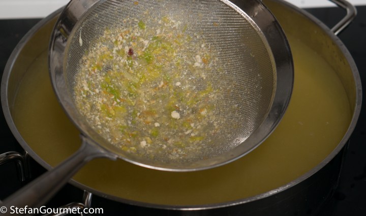 When the lobster stock has simmered for an hour, strain it, discarding the solids.