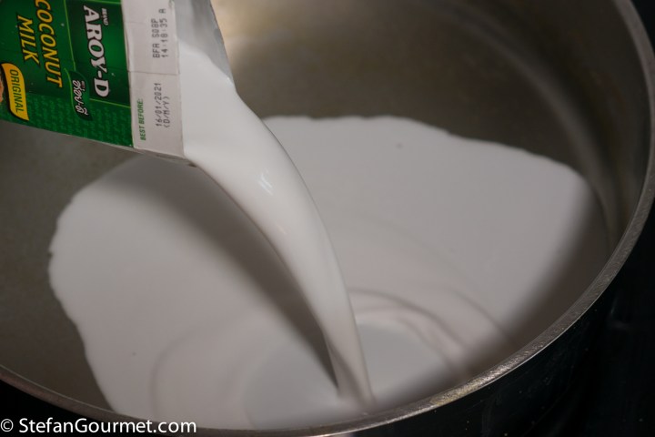 Heat a tablespoon of vegetable oil in a saucepan and add two tablespoons of green curry paste. Stir over medium heat until fragrant, about 1 minute.