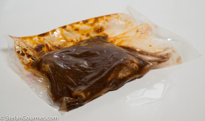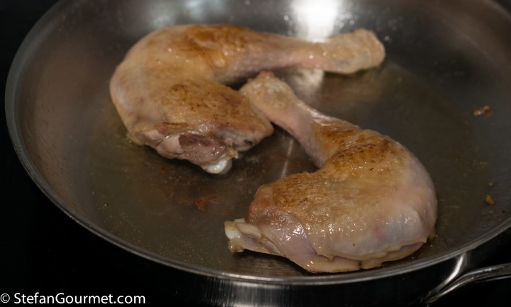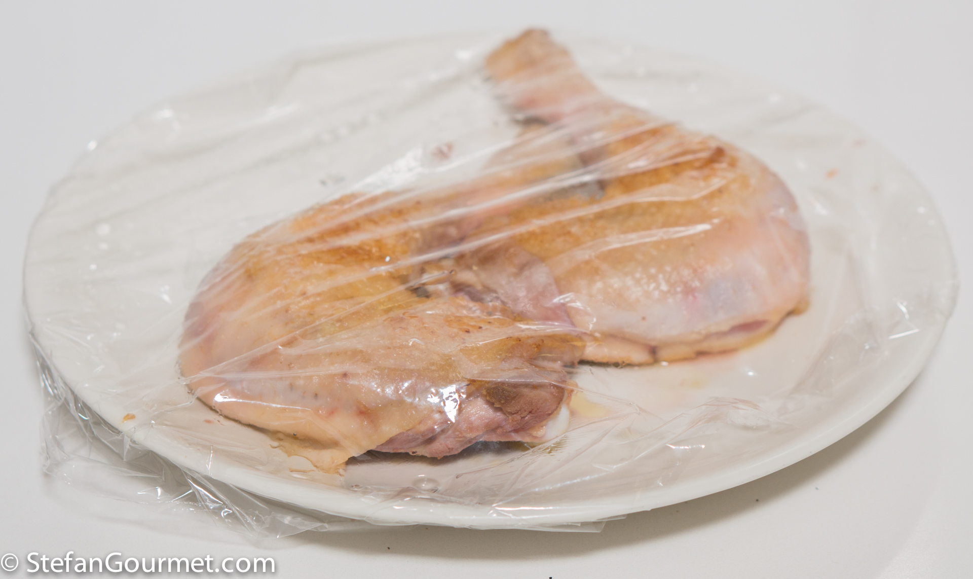 Cooking this dish sous vide has as the advantage that the chicken will be super tender and moist. Leg meat of chicken is dark meat, so it will look pink. If you think this is undercooked, perhaps you should stick to the classic recipe, or increase the sous vide cooking temperature. However, if you do do, you may just as well prepare the classic version. This chicken was cooked for 24 hours at 60C/140F. 24 hours sounds like a long time, but it is actually quite convenient as you could prepare it the day before, drop it in the sous vide and just forget about it for the next 24 hours or so. It doesn’t really matter if you cook it for 20 hours or 24 hours or 28 hours. When it is time to serve, you can basically serve it straight from the bag. Of course this tastes better if you use organic / free range chicken.