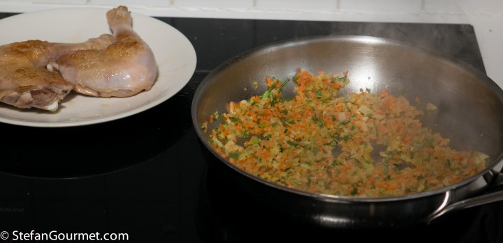 Take the chicken out of the pan and allow to cool on a plate. Add minced carrot, onion, sage, and rosemary to the pan without cleaning it.