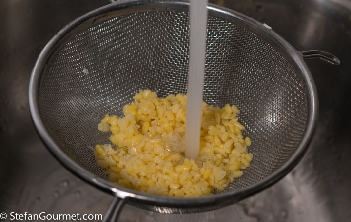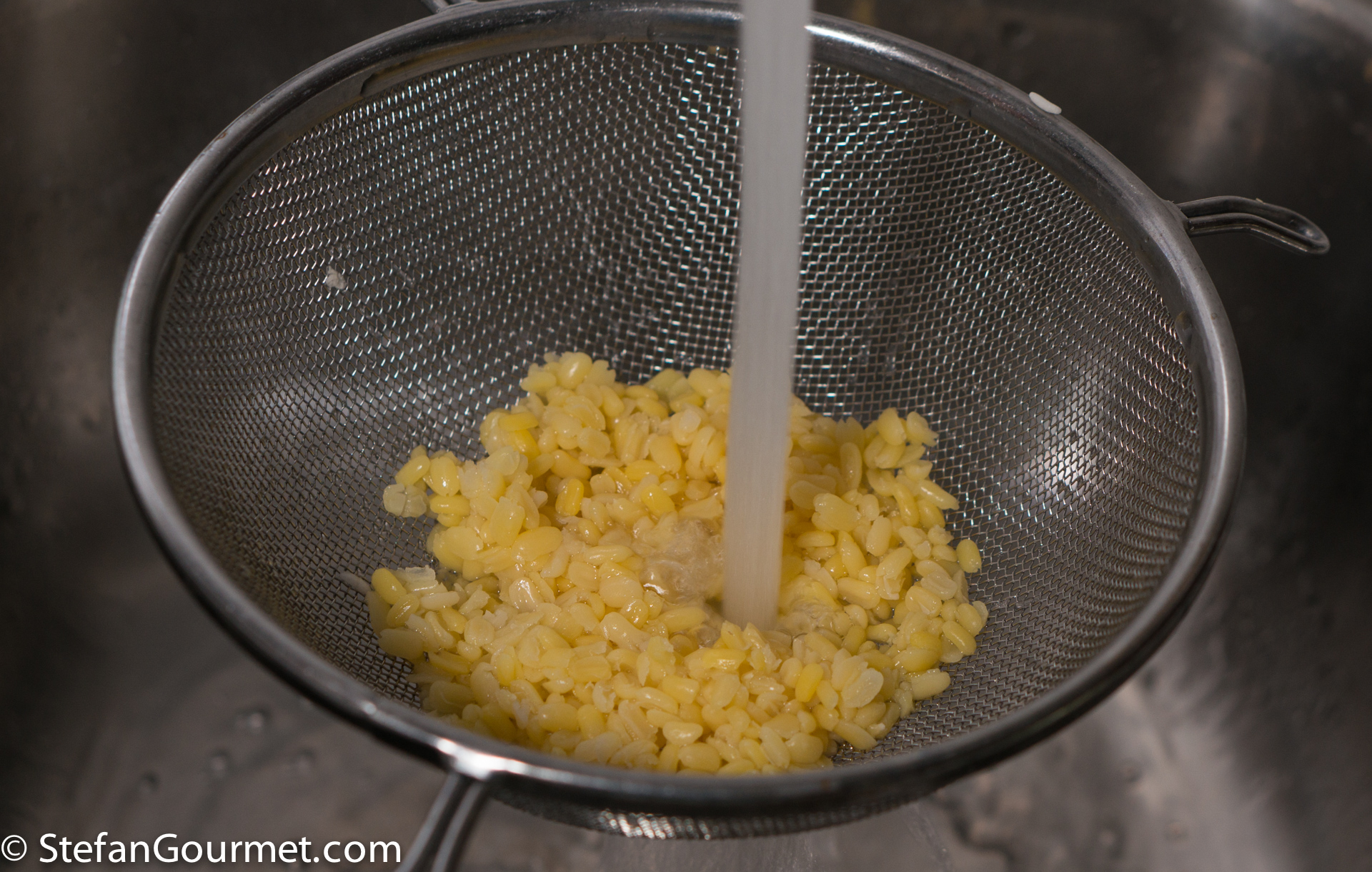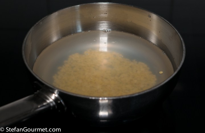 For the toasted mung beans, rinse 2 tablespoons of shelled split mung beans twice in cold water. Then put them in a saucepan and cover with half a litre (2 cups) of cold water.