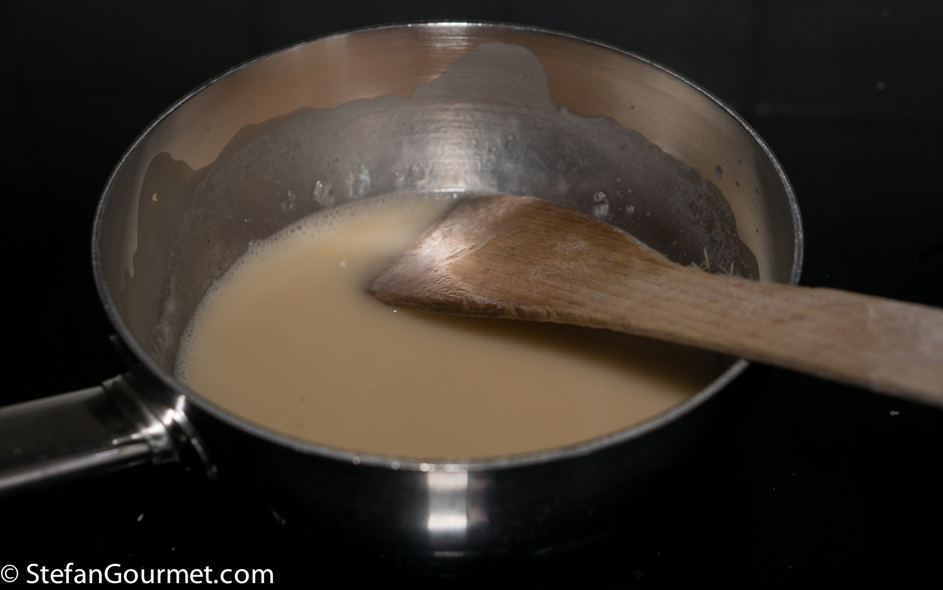 For the salted coconut sauce, put 120 ml coconut milk in a saucepan. Mix 1 teaspoon of rice flour with 1 tablespoon of cold water and mix well until there are no lumps. Add this slurry to the coconut milk.