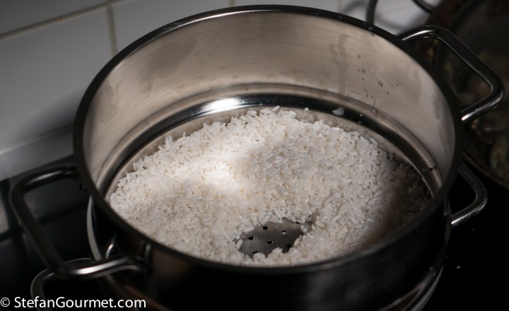 Put some water in the steamer, cover the rice, bring the water to a boil, and steam the rice for 30 minutes.