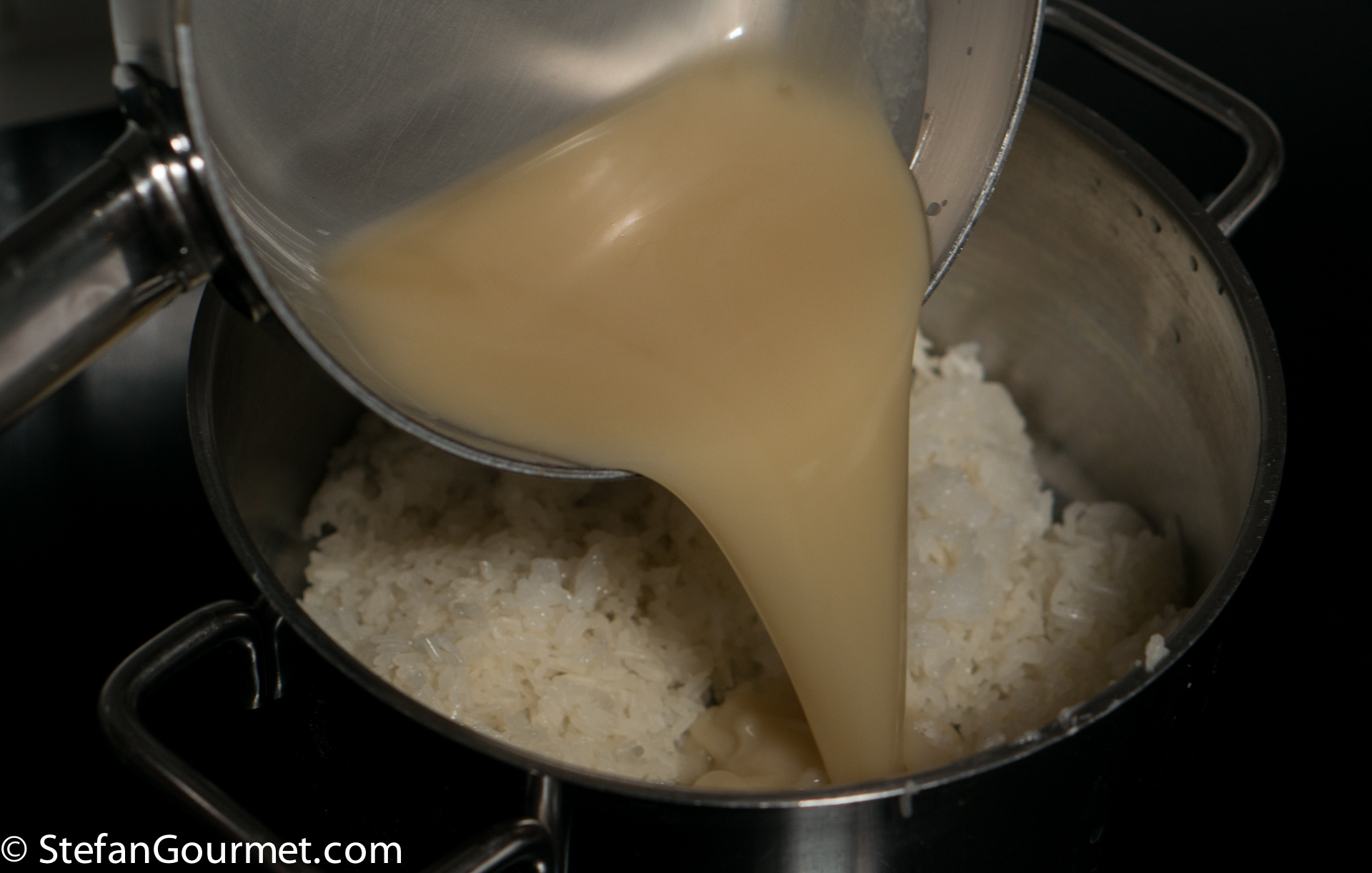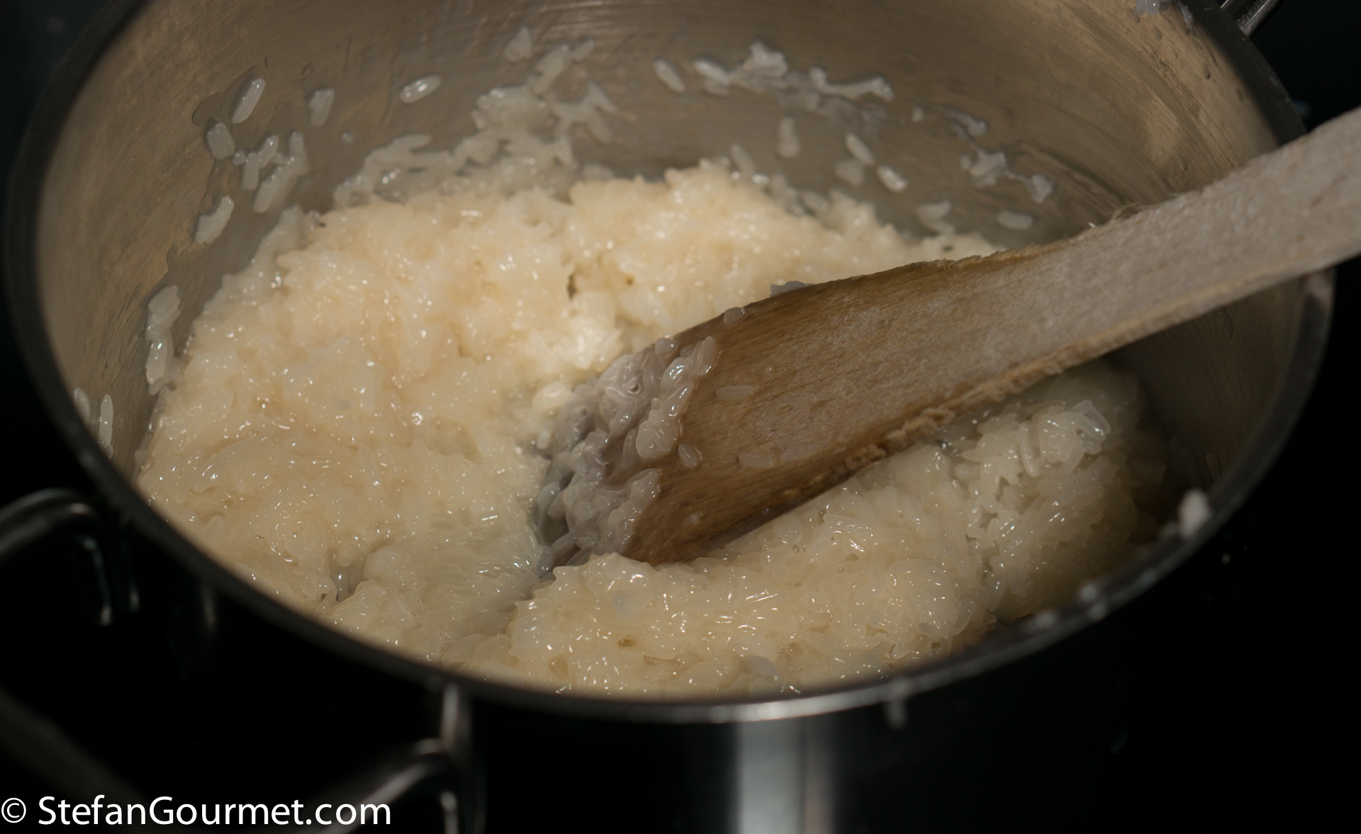 Once the rice has been steamed, mix it with the coconut syrup. It doesn’t matter if you add the rice to the syrup or the syrup to the rice, whichever is most convenient.