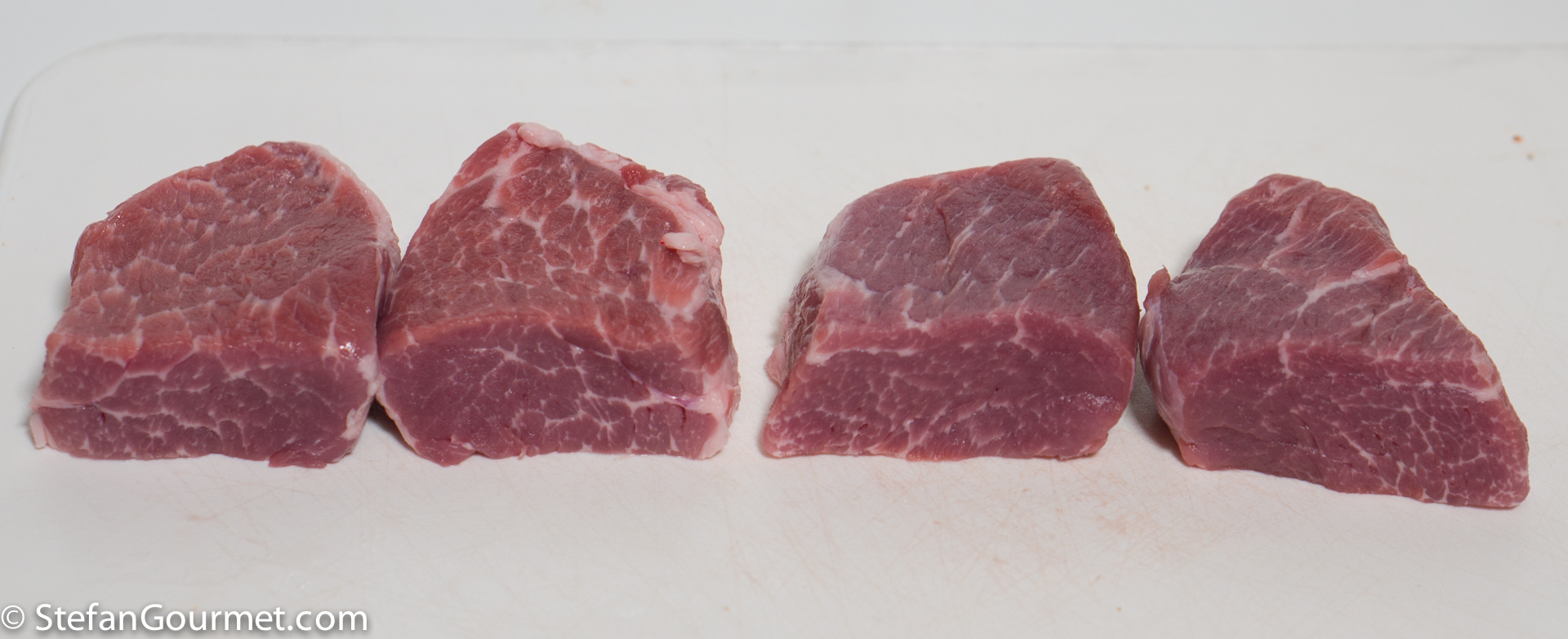 Pork neck or pork shoulder, in the US referred to as pork butt, is one of my favorite cuts of pork. It is cheap and very flavorful thanks to the marbling and connective tissue. If you are familiar with my blog, it won’t come as a surprise that my favorite way to cook it is sous vide. I’ve been cooking this cut either for 24 hours at 57C/135F or for 24 hours at 74C/165F, depending on whether I wanted to have a juicy, tender, and pink result like in this recipe for char siu, or something more like pulled pork. Lately I have been interested in exploring temperatures in between, and so it is time for another side by side experiment. For this experiment I sliced 4 pieces out of a pork neck of approximately equal size and with a similar amount of marbling, to make the comparison as fair as possible.