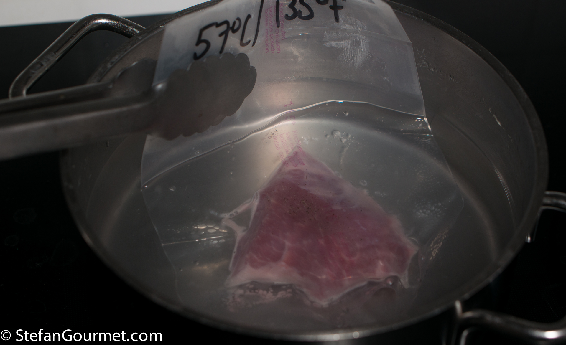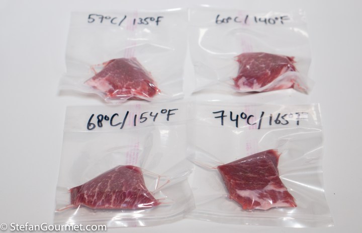 For cooking at 57C/135F it is important to scald the meat in very hot or boiling water (at least 77C/170F), after vacuum sealing but before sous vide cooking, to avoid a bad smell. To make the comparison as honest as possible, I gave all four pieces that treatment.
