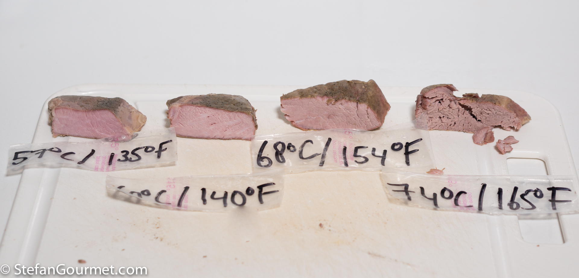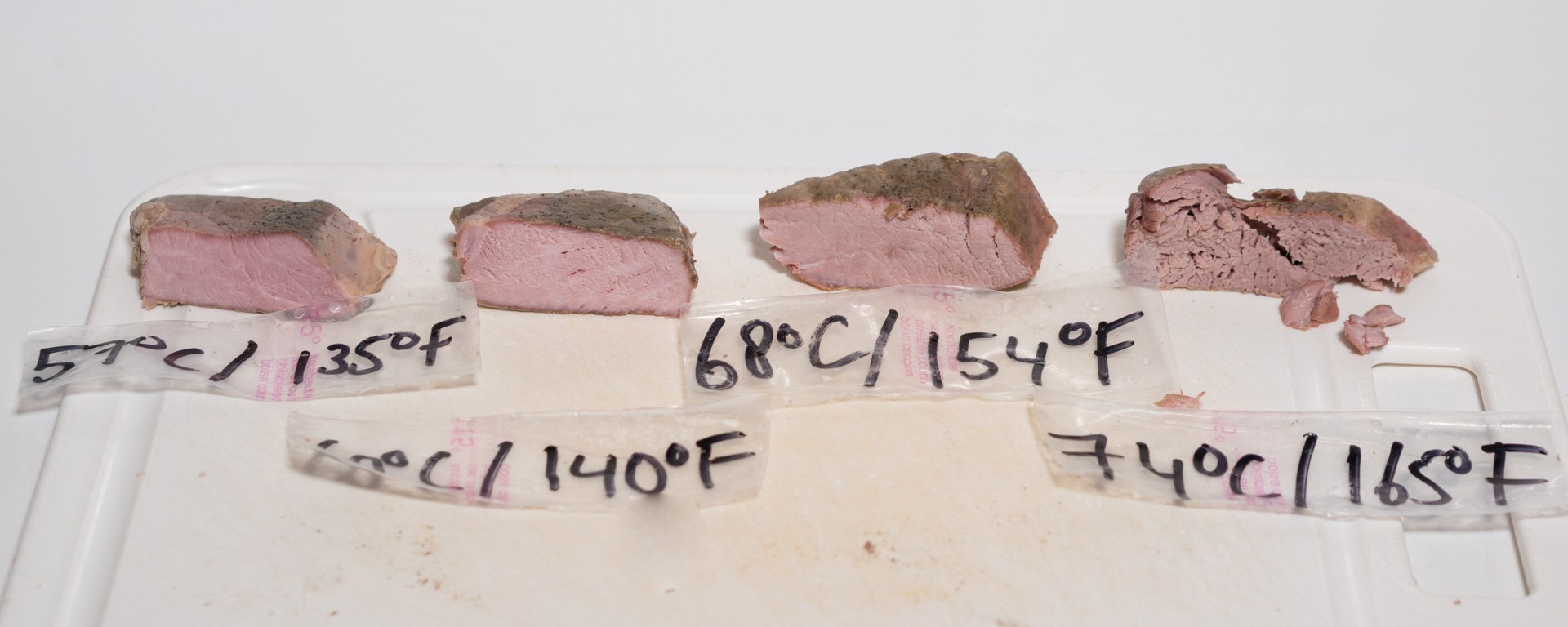 As often with experiments, this calls for a follow up experiment. Next I’d like to try temperatures between 60C/140F and 68C/154F, as well as 71C/170F, and perhaps try 68C/154F for 36 hours instead of 24 to see if it will become less firm with more time.