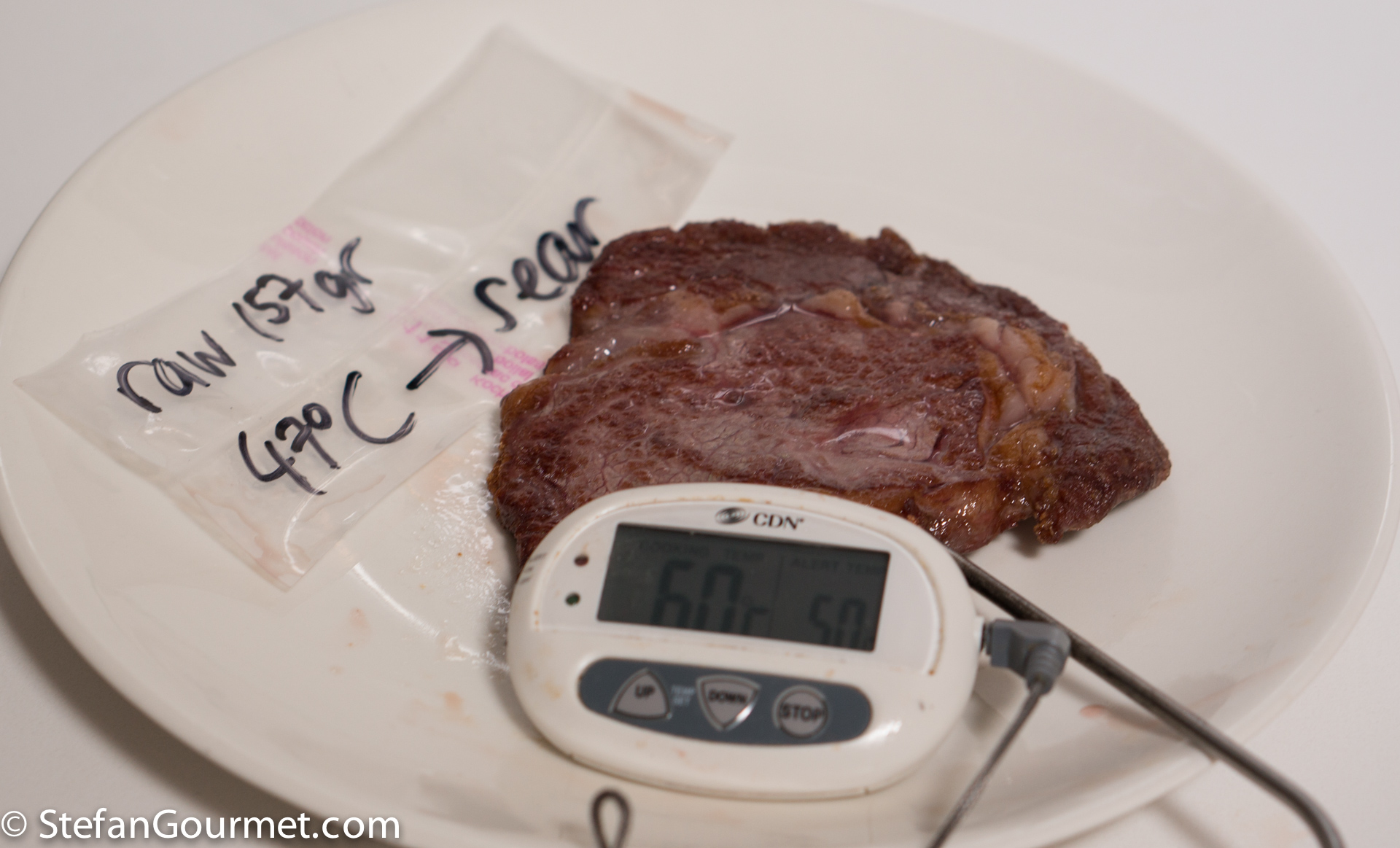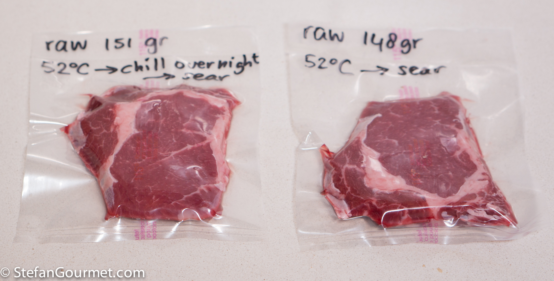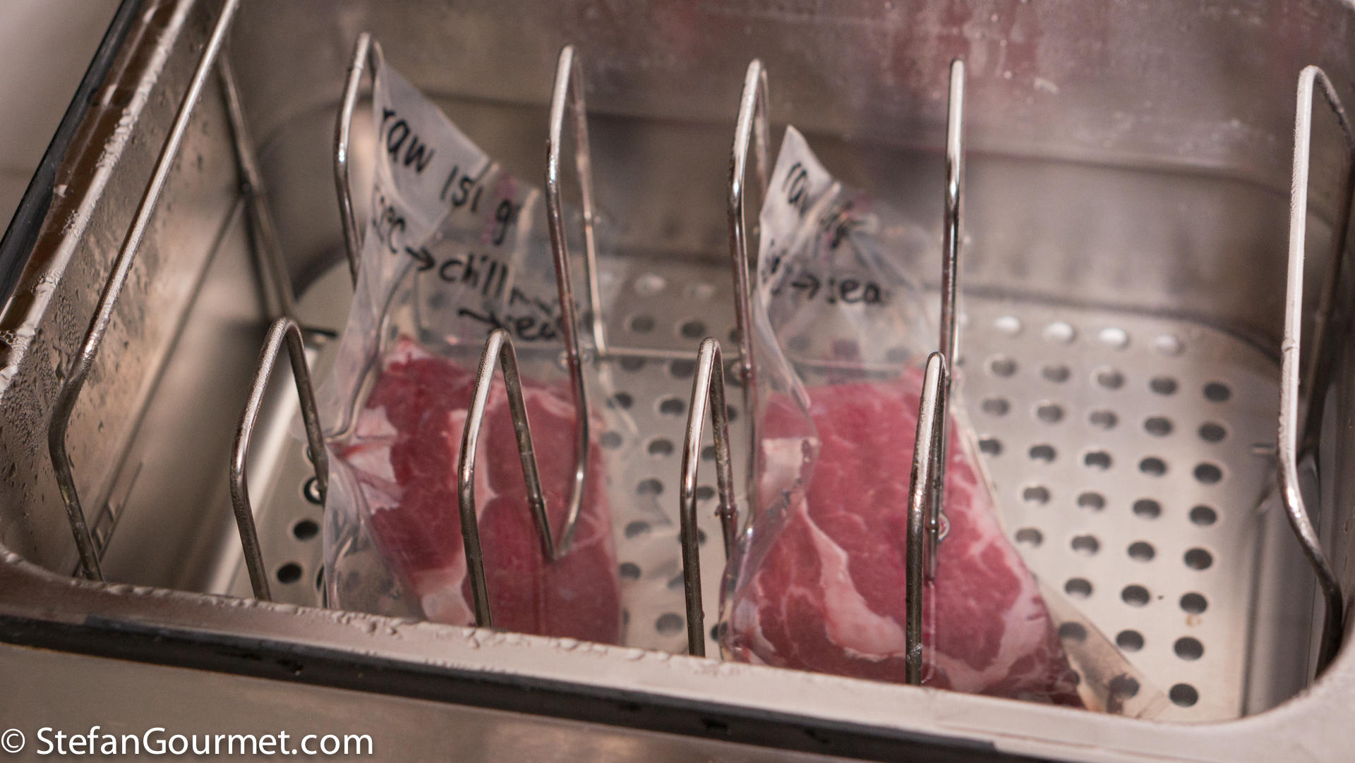 …but one of them was chilled immediately after sous vide cooking and kept overnight in the refrigerator. Please note that I could have added ice cubes for faster chilling, but with a steak as thin as this cold tap water followed by the refrigerator is quick enough.