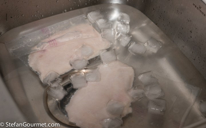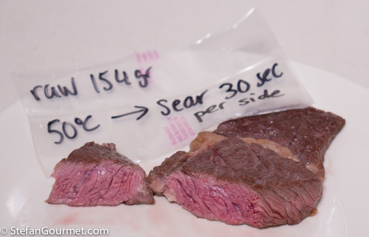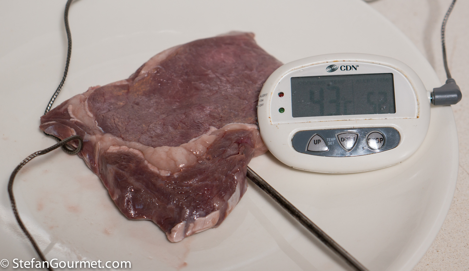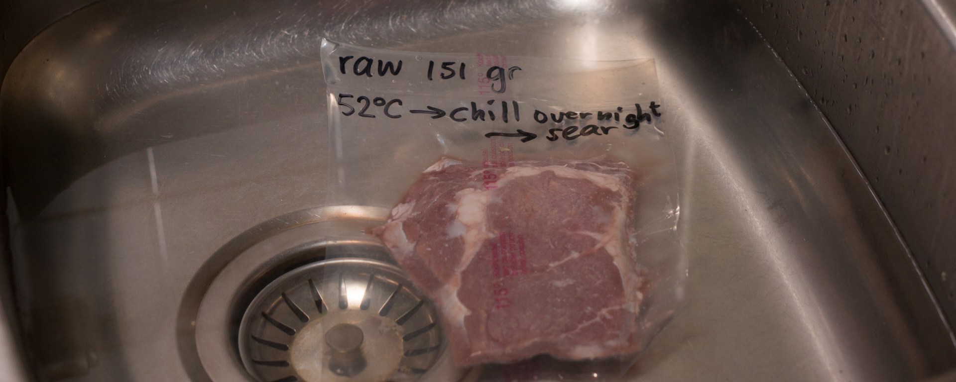 …but one of them was chilled immediately after sous vide cooking and kept overnight in the refrigerator. Please note that I could have added ice cubes for faster chilling, but with a steak as thin as this cold tap water followed by the refrigerator is quick enough.