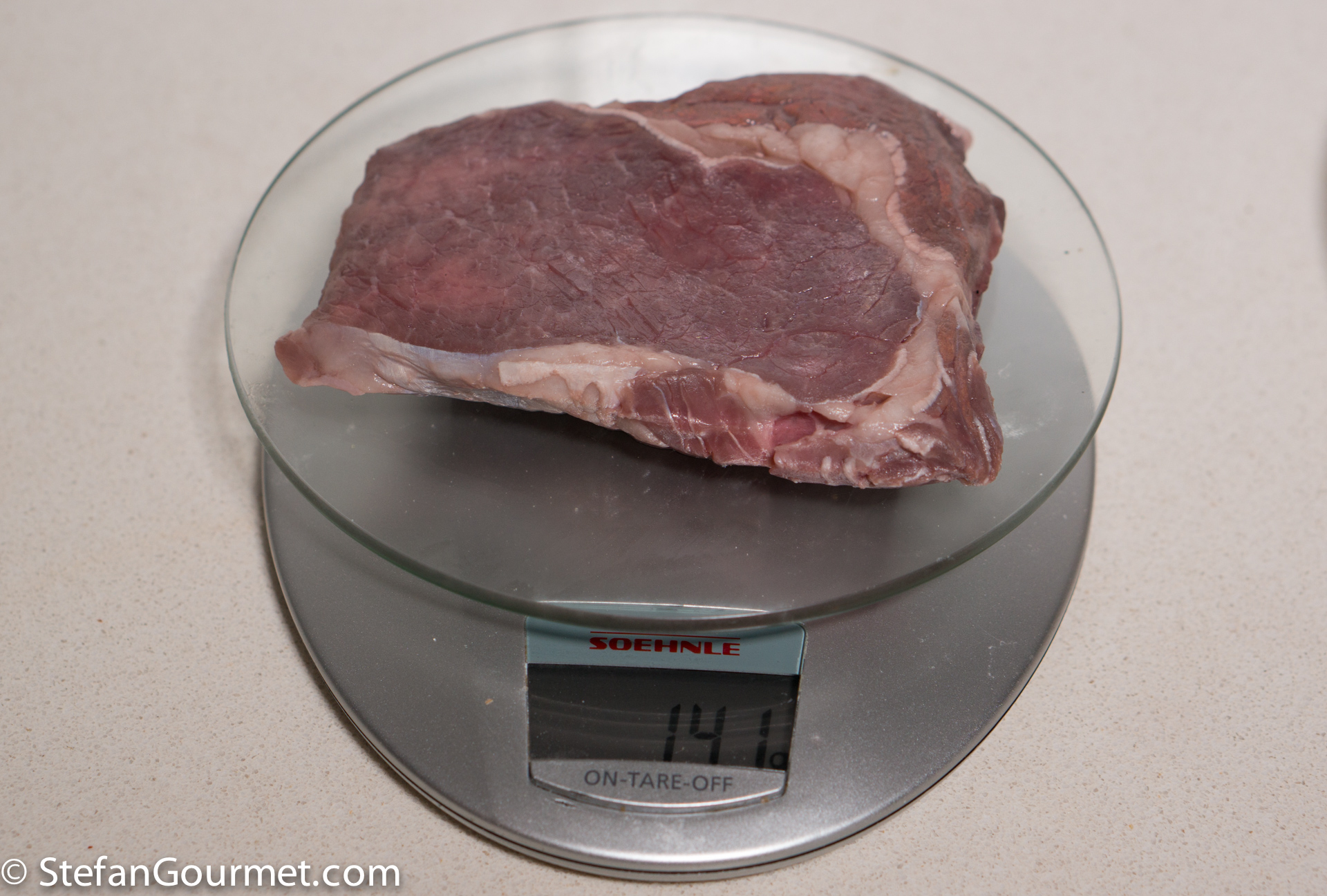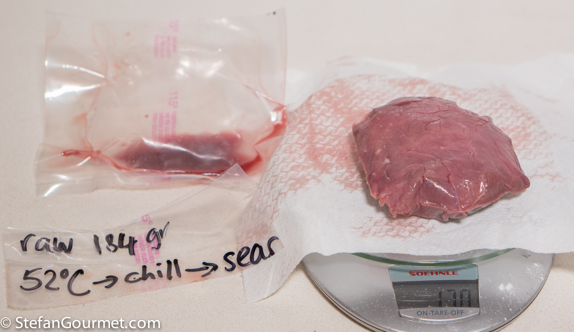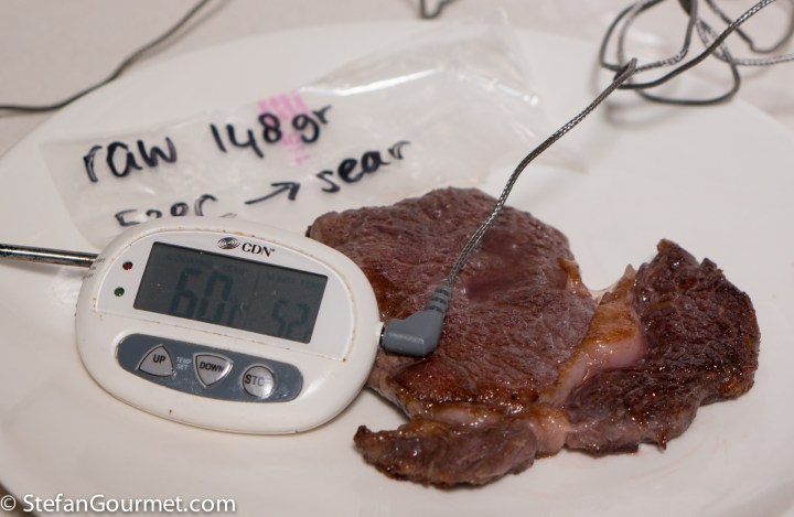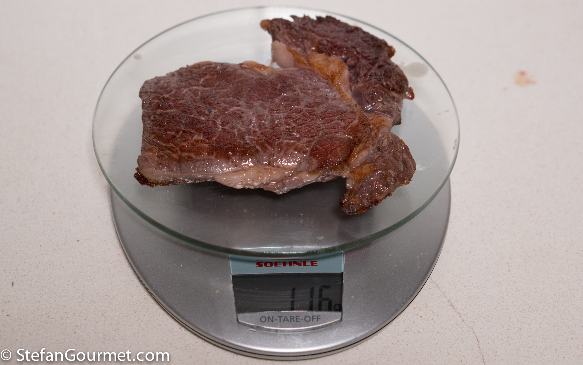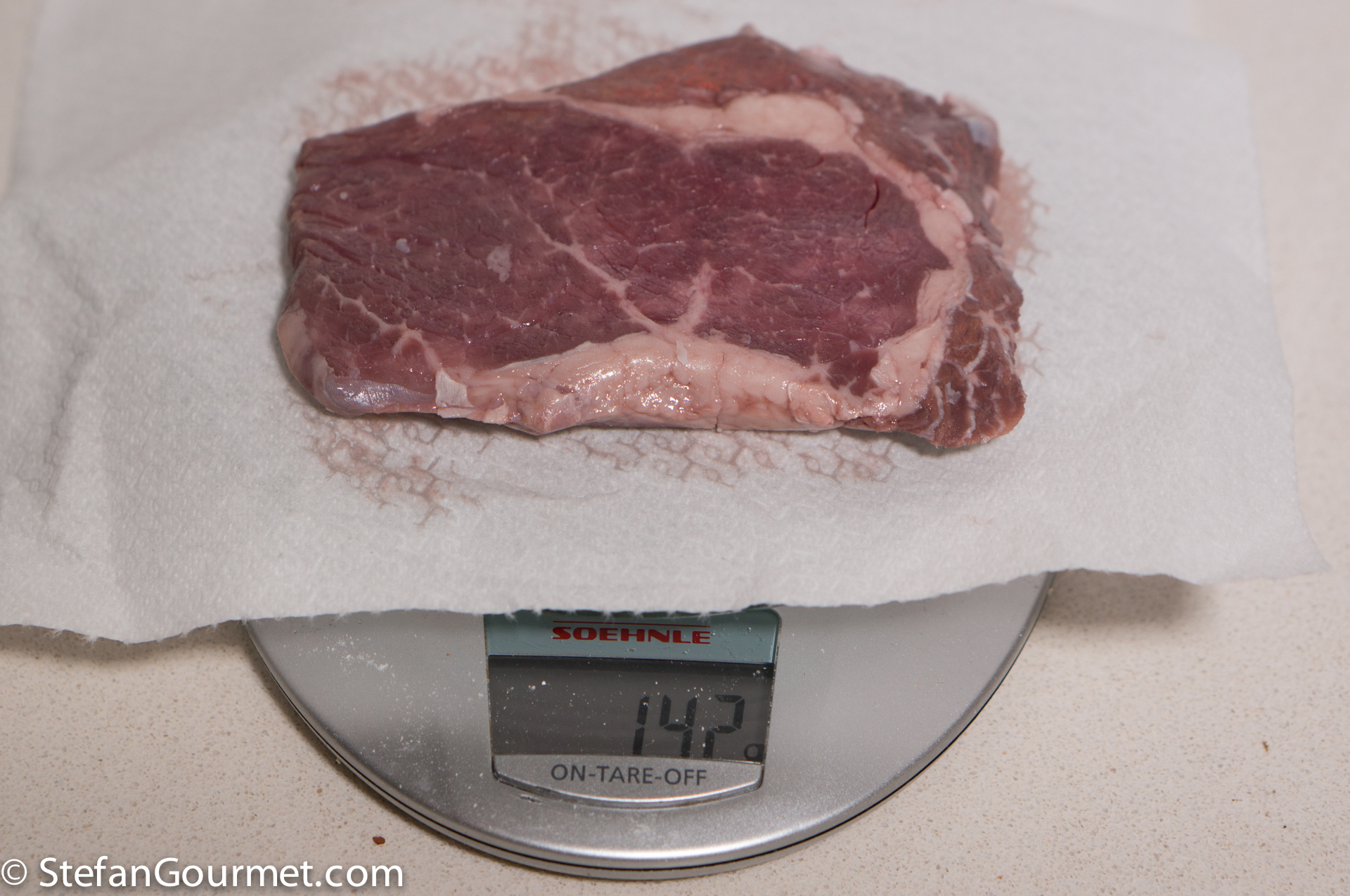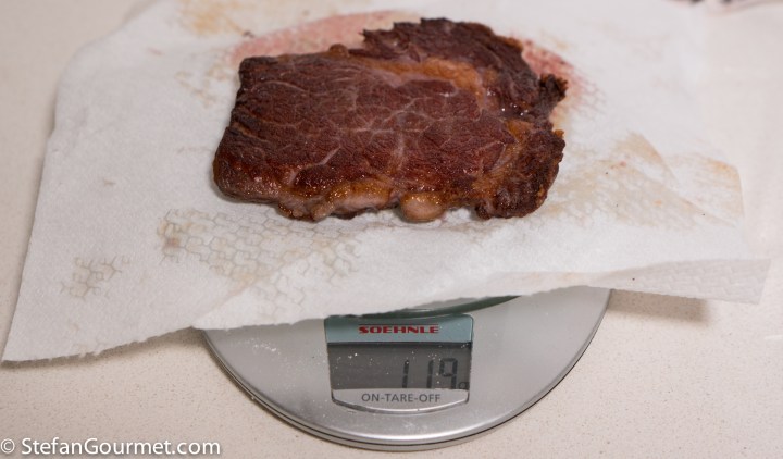 …and weighed it, after patting it dry. This steak has gone down from 151 grams to 142 grams, or a moisture loss of 6%.