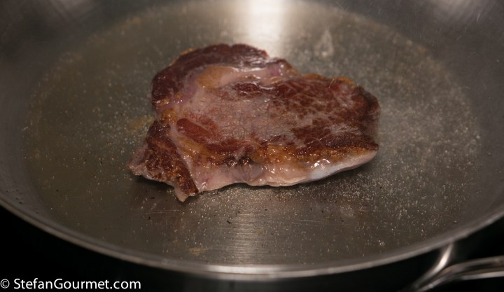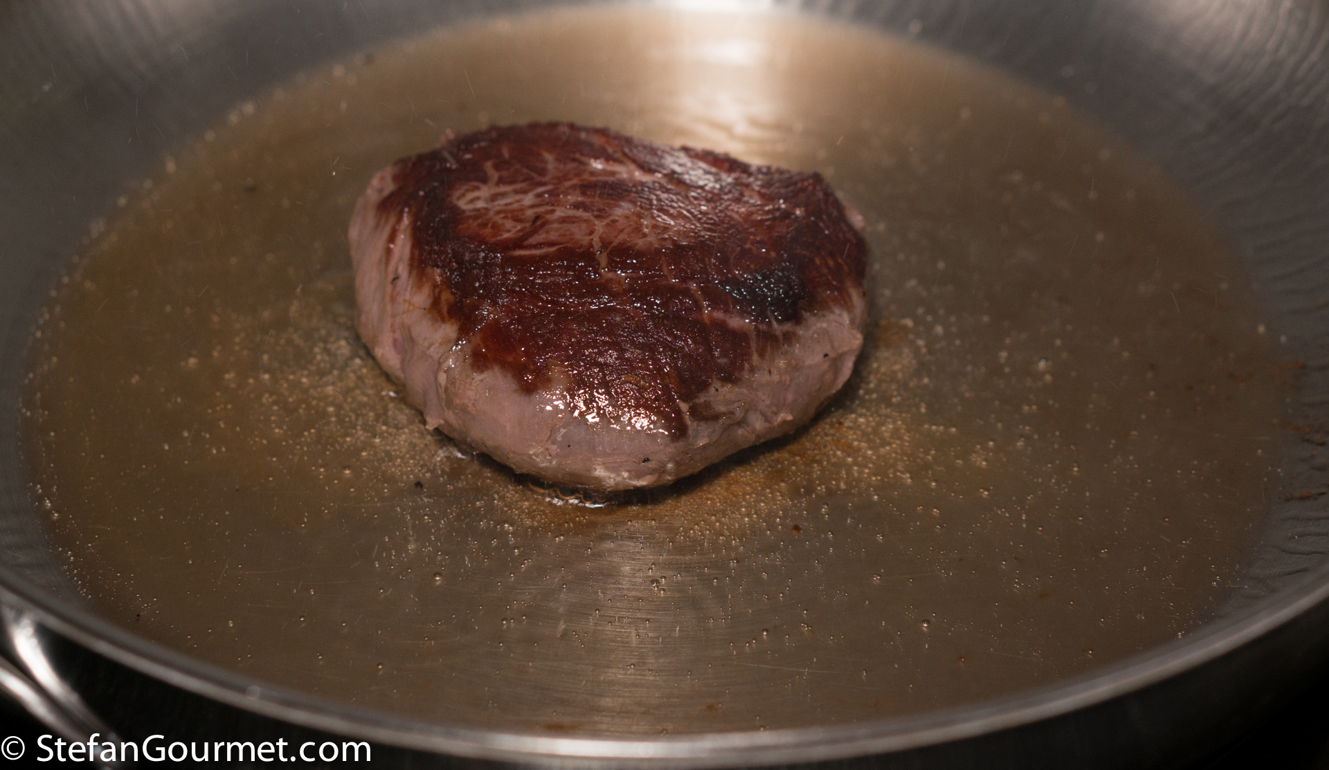 Then I seared the steak in clarified butter in a very hot frying pan for 1 minute per side, turning just once.