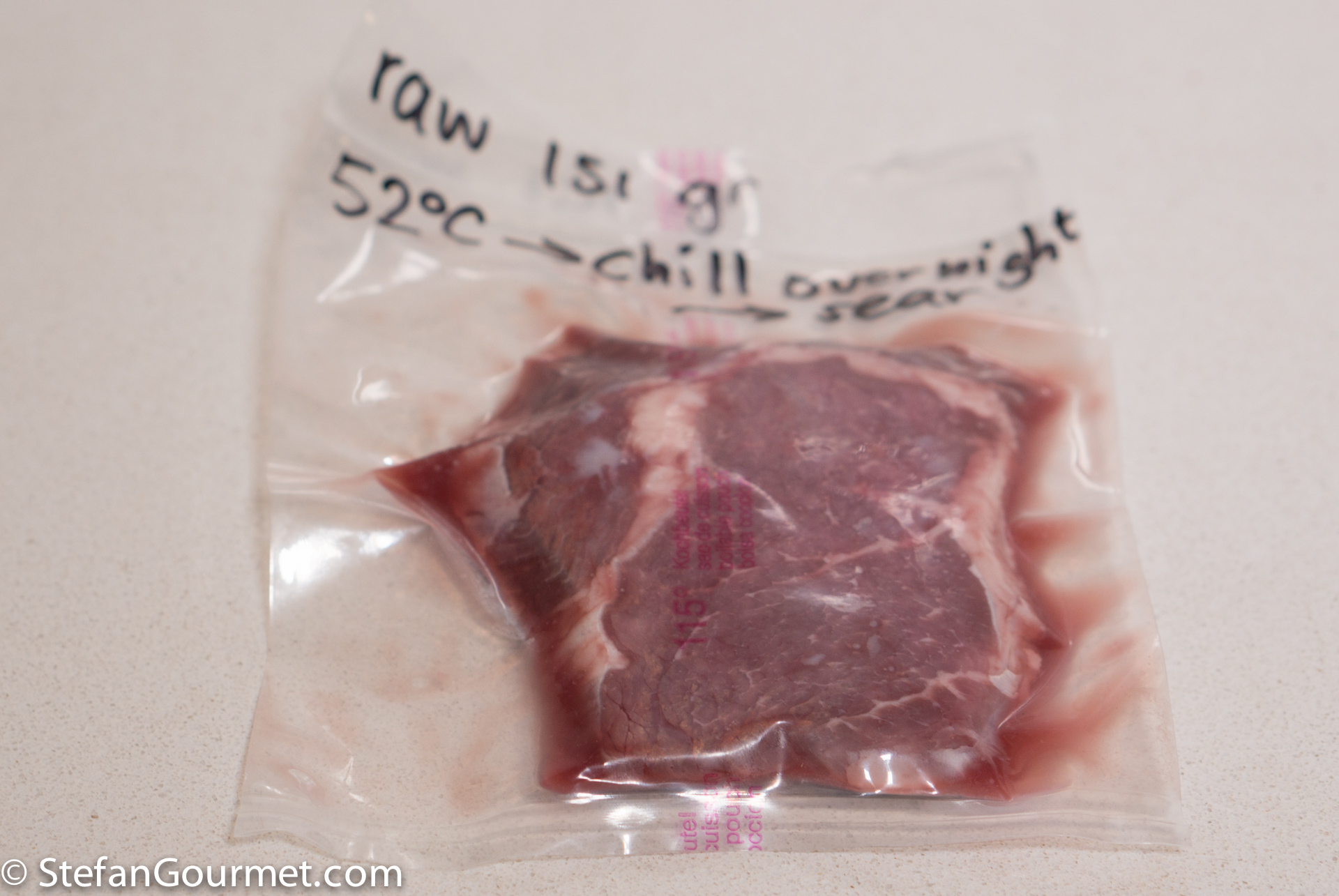 This is more complicated, because the steak has to be chilled before it can be vacuum sealed.