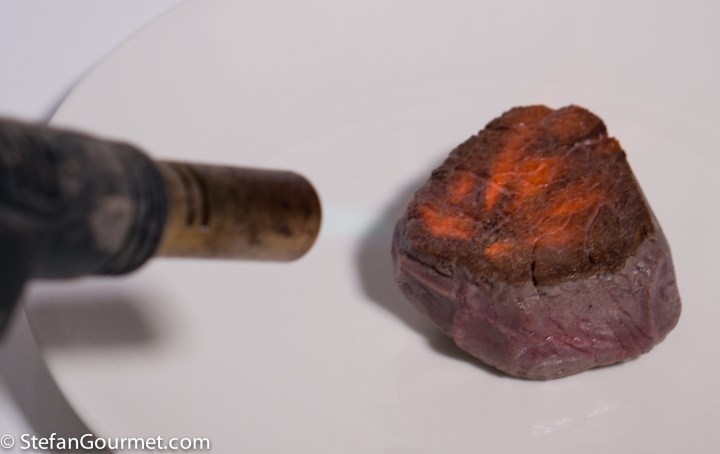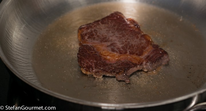 It’s interesting to note that after sous vide cooking, the thermometer showed a core temperature of the steak that was going to be seared of only 43C/109F, even though it had been close to 52C/126F in the sous vide just minutes ago. This goes to show quickly such a thin steak cools off (as well as the initial temperature of the probe).