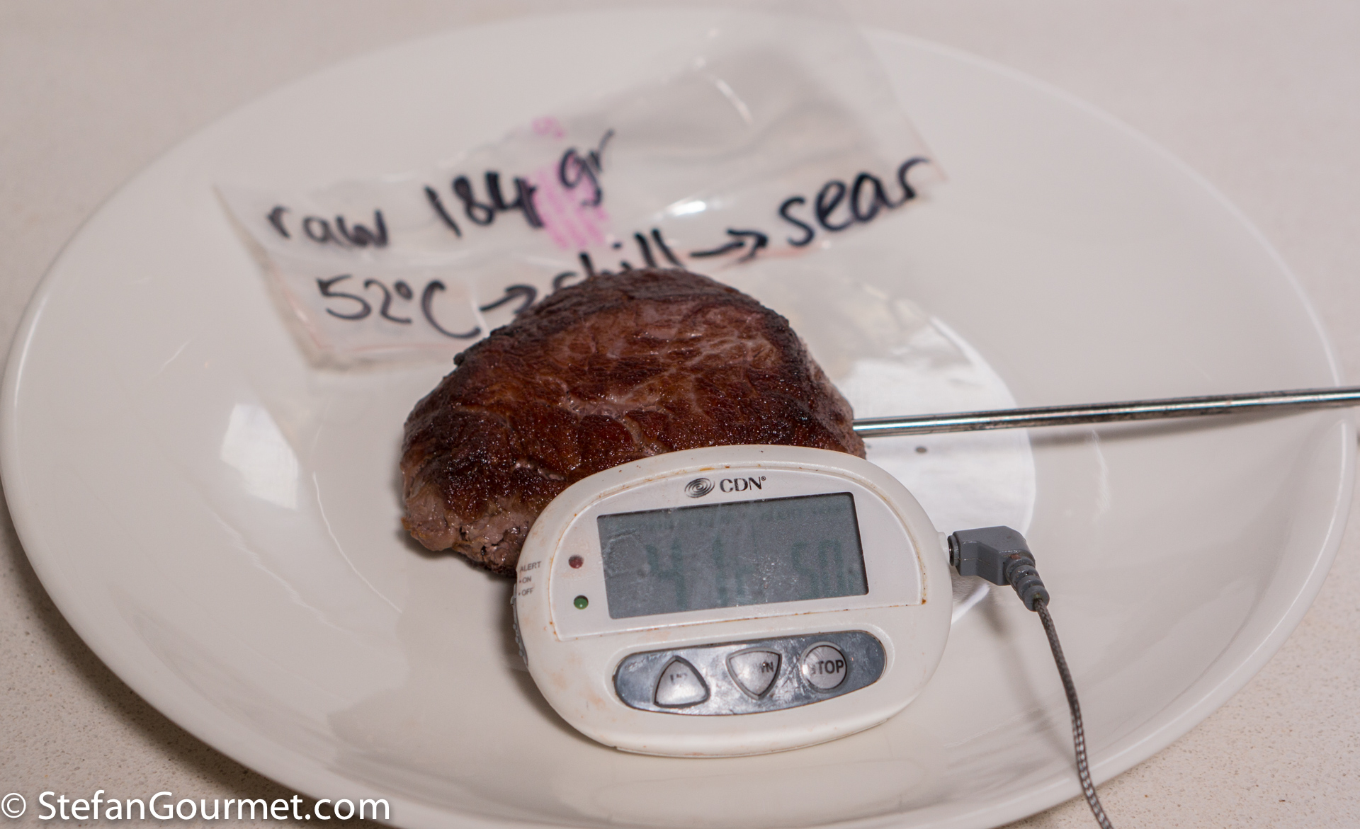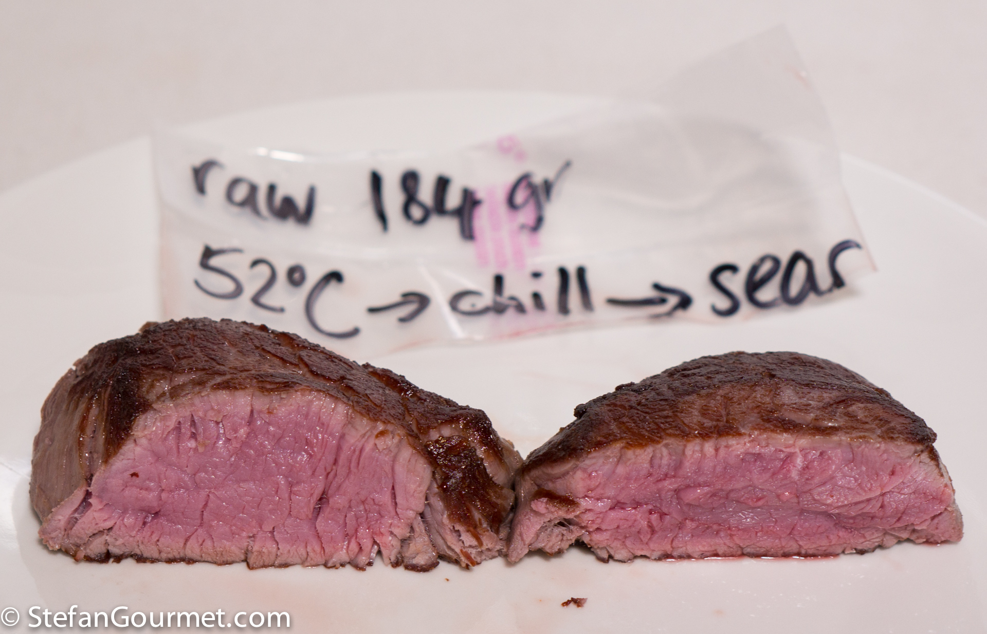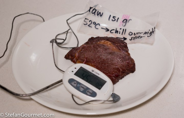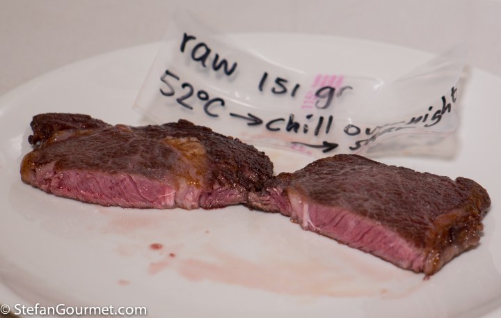 So by cooking the steak at 52C/126F and searing it right away without chilling, it actually ends up with a core temperature of 60C/140F and is medium. So this is the reason why some chilling can make sense if you are going to eat the steak straight after sous vide cooking.
