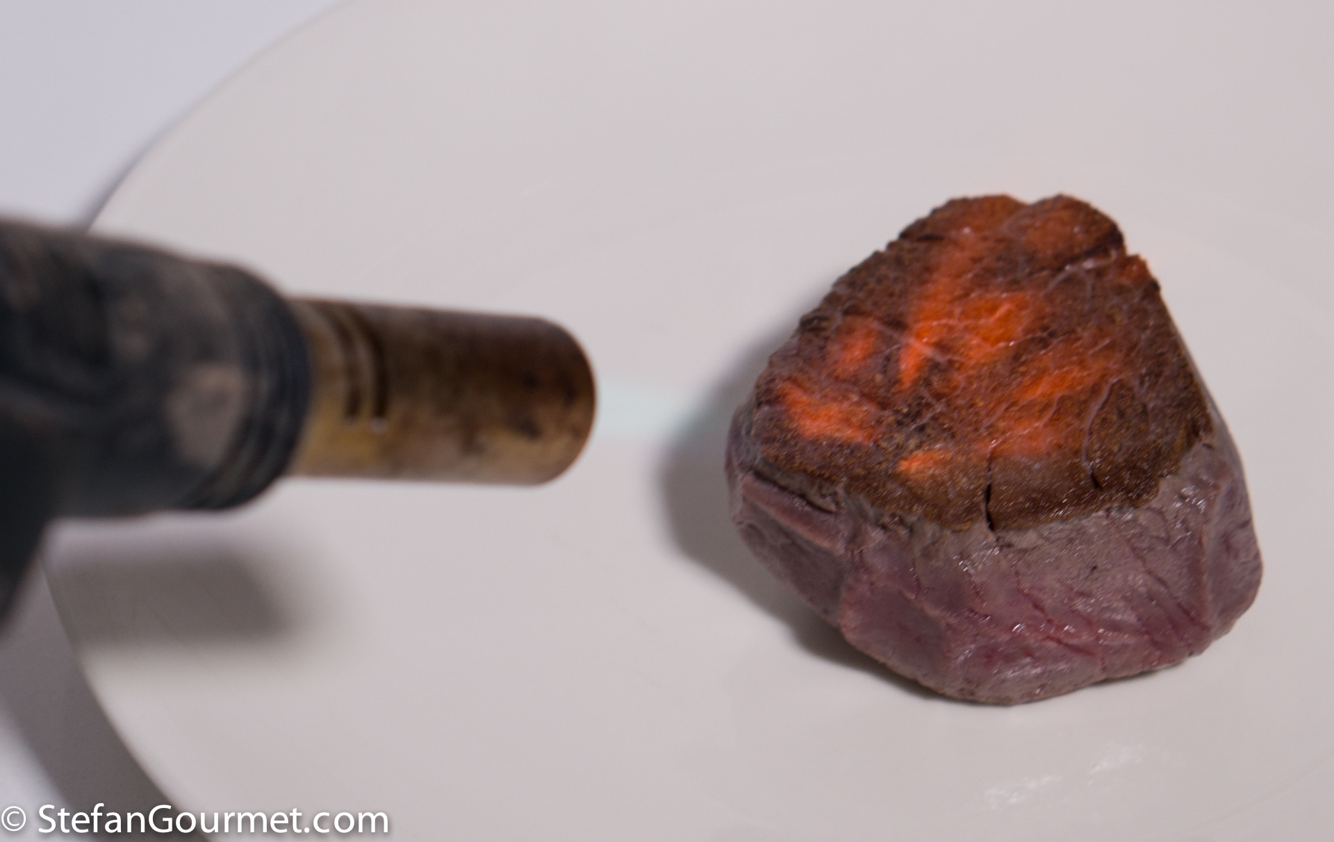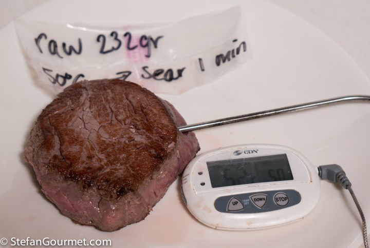 It would have been possible to increase the serving temperature by searing for a longer time or even by using the oven, but that would lead to an uneven cooked fillet mignon and I really don’t understand why you would first cook a fillet mignon sous vide and then cook it again the traditional way (sear + oven), as you could just as well leave out the sous vide step. Or you could reheat it sous vide before searing, but then there was no need to have already cooked it sous vide before chilling it.