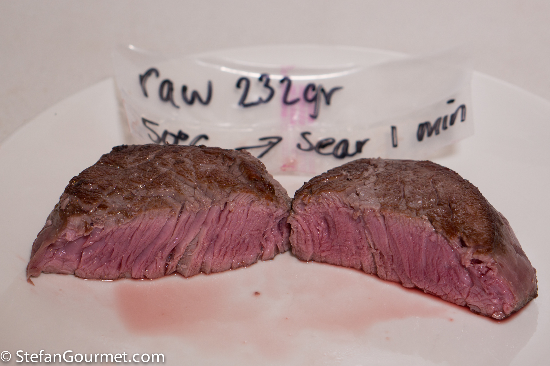 The fillet mignon in the photo above was cooked in the traditional way without sous-vide: sear it first, and then finish it in the oven until the desired core temperature (of in this case 50C/122F). It meets the criteria of being seared on the outside and being served warm, but as you can see the cooking is far from even. A very large portion of the fillet mignon is overcooked. Only the center is rare to medium rare.