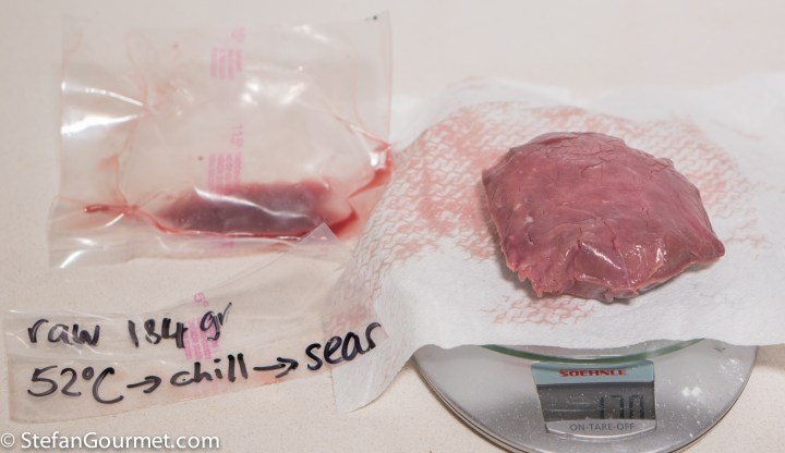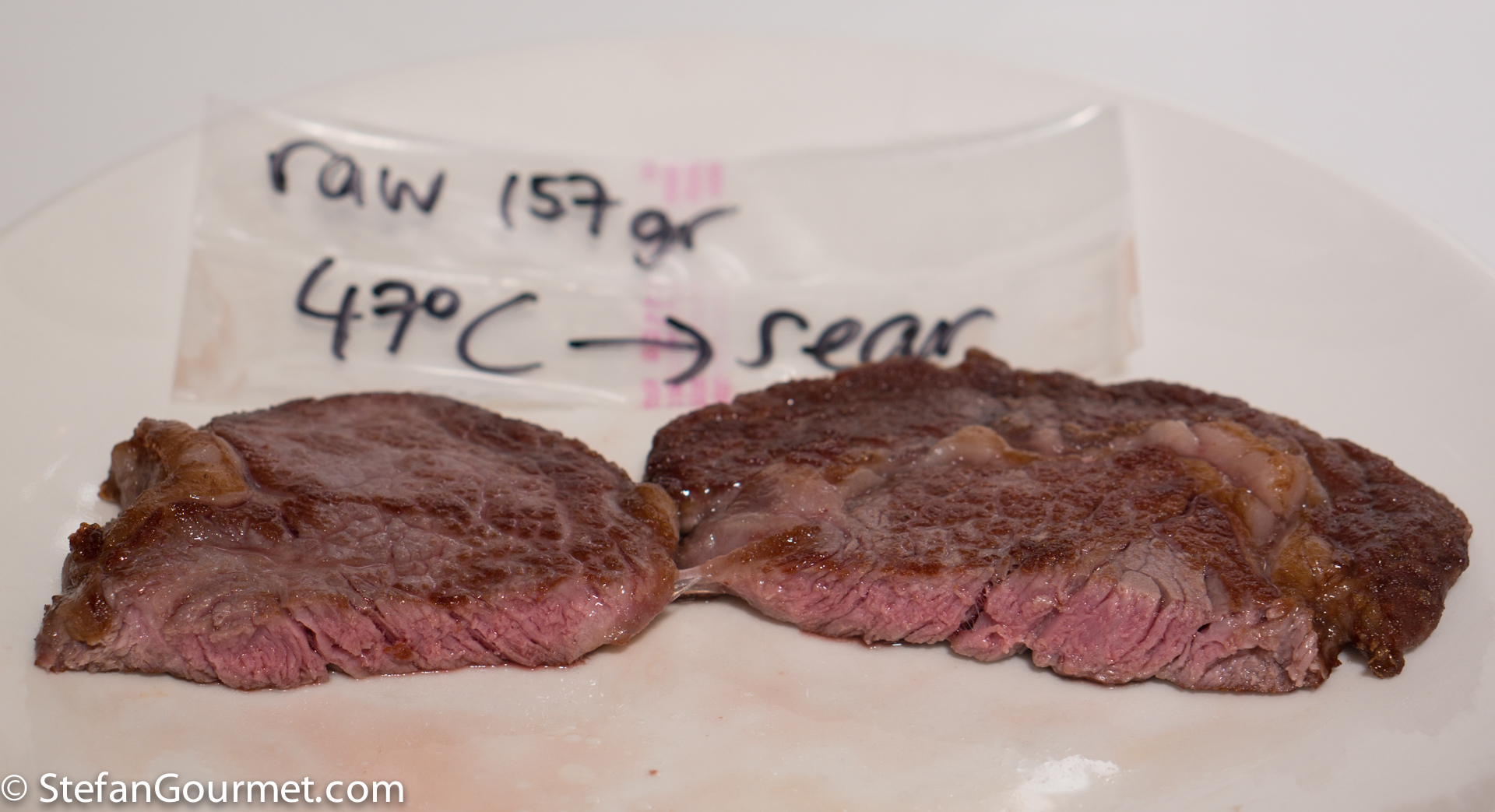 I weighed the steak (after patting it dry with paper towels) and from 2 hours of cooking it had gone down from 148 grams to 141 grams, or a loss of juices caused by the sous vide cooking of 5%.