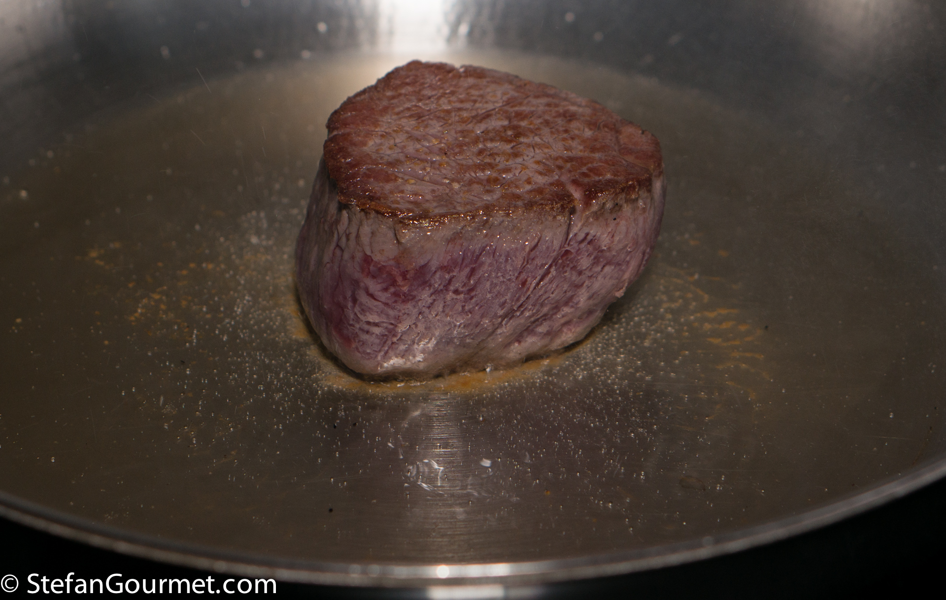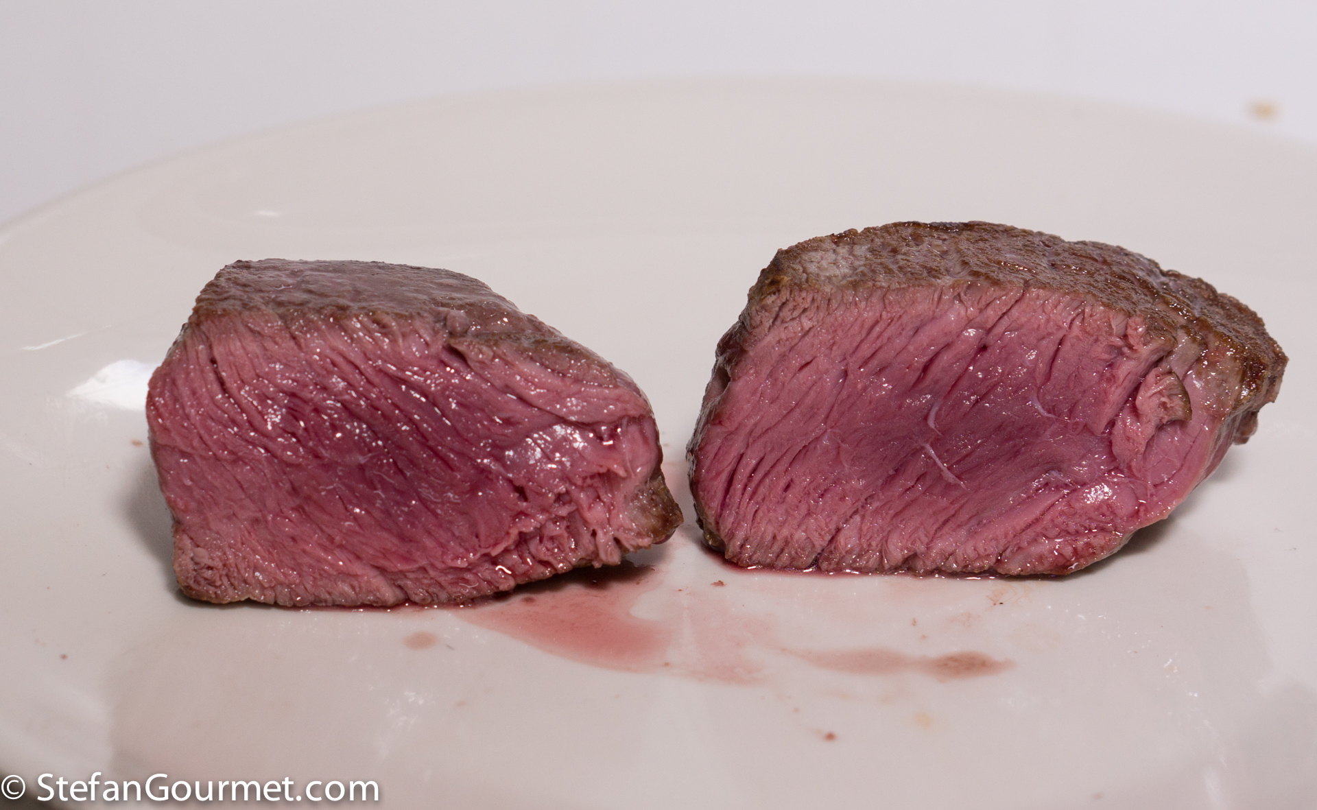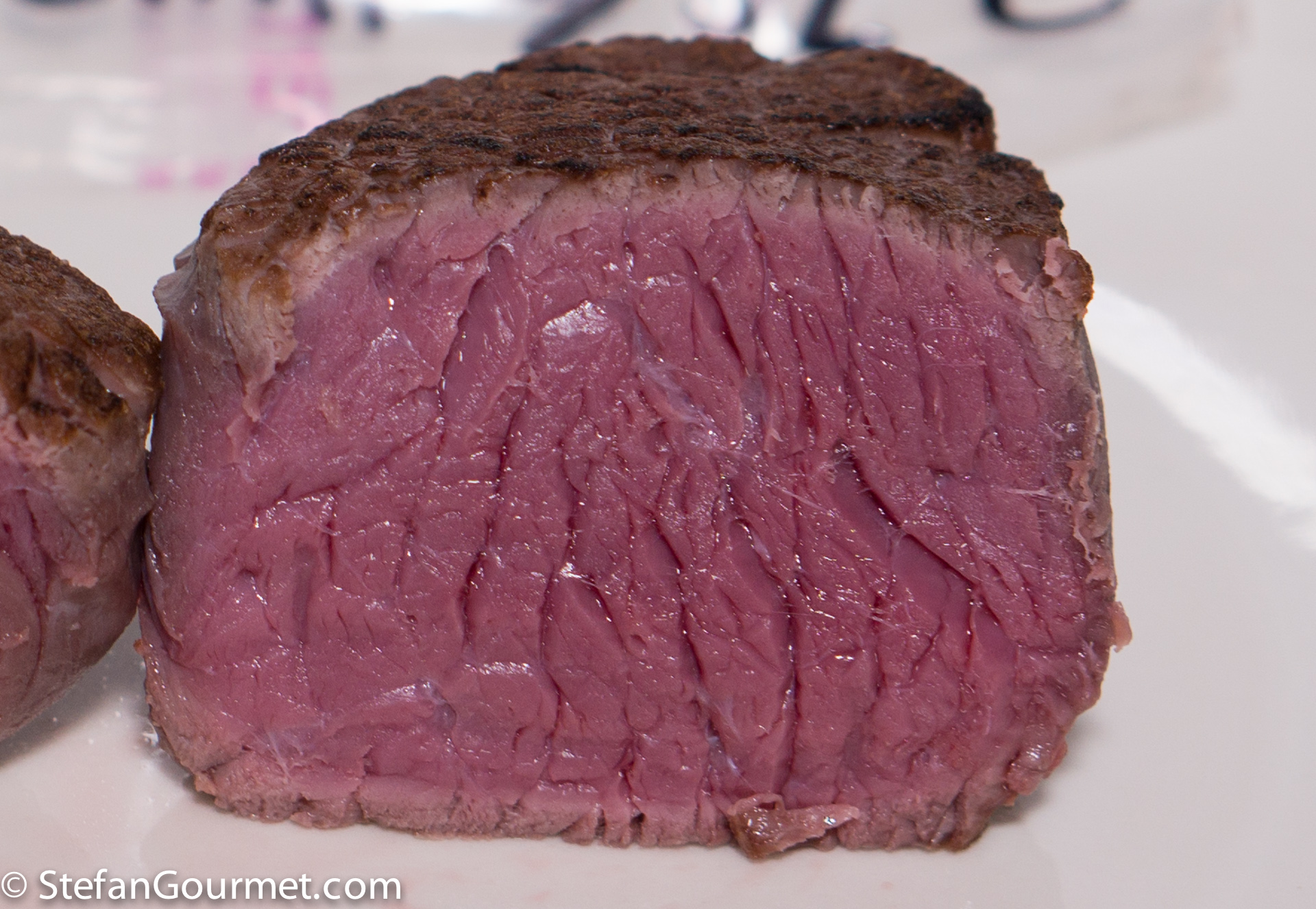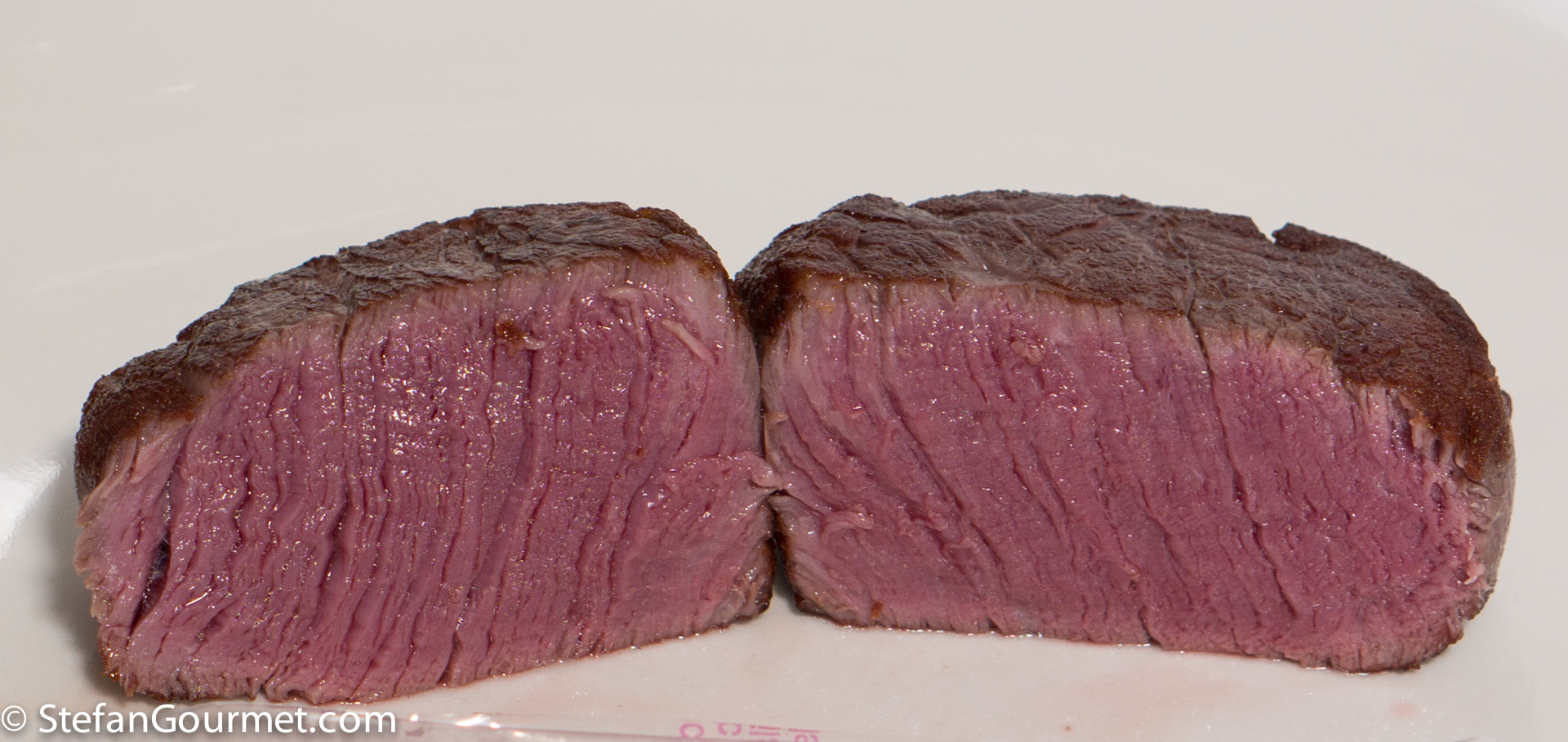 The result is again a perfectly cooked fillet mignon. The advantage of this method compared to cooking the fillet mignon a few degrees lower than the doneness you want and then searing it, is that by searing first you have perfect control over the final doneness. If you sear afterwards, it can end up a bit more done or a bit less done than you wanted.
