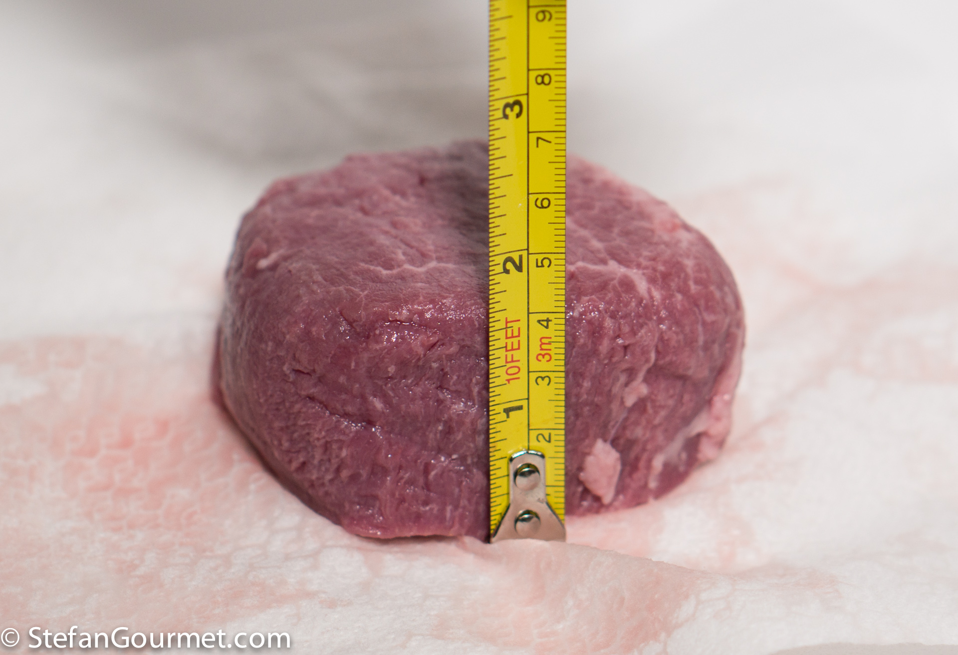 …and fillet mignon (beef tenderloin, beef fillet) of approxiamtely 4 cm (1 1/2 inch) thick. Each was about 150 grams (5-6 oz), so a nice portion for my post-workout meal in the weekend. As we will see, the thickness plays an important role in determining how to achieve a well seared, evenly cooked steak at the right serving temperature.