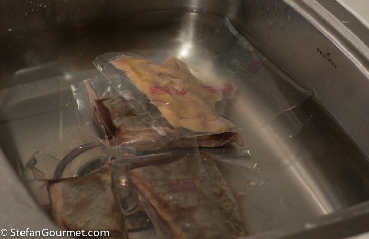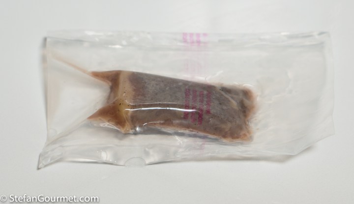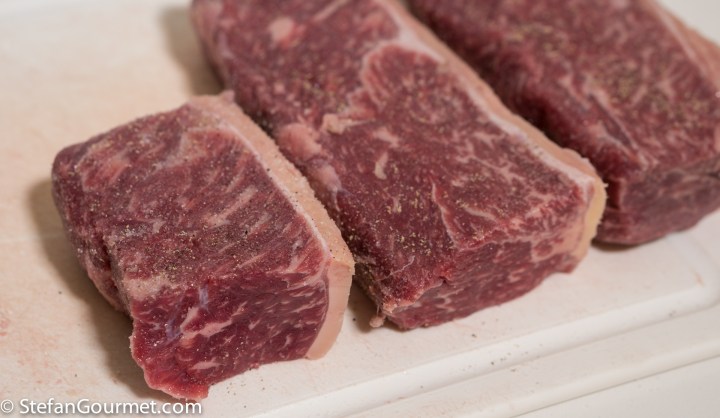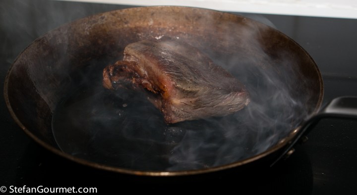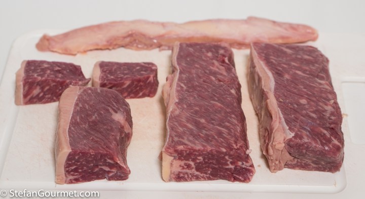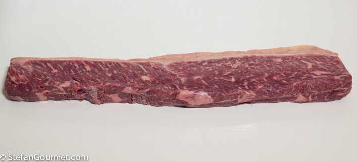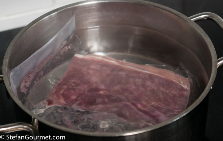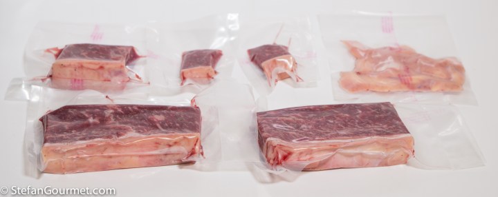 I tried to google it to find out what it was, but found contradicting information. According to some source it is cross-cut strip steak, according to others cross-cut boneless short ribs. Because of the high amount of marbling I decided to cook the beef sous-vide at a temperature of 57C/135F.