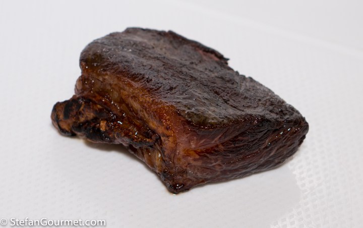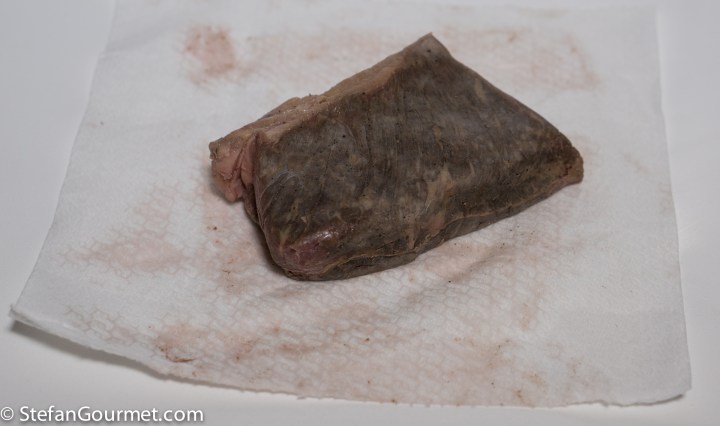 The fat curled up and shrunk a lot. Later I would discover that the connective tissue between the meat and the fat is too tough and not edible after 24 hours at 57C/135F, even though the meat is perfectly tender. So it seems that the fat cap is left on to keep the meat together (and to sell more weight), rather than for the flavor. You can also tell that the fat cap is not going to be used because the bife de tira is cut in such a way that if you slice it against the grain, there will be no fat cap in the slices.