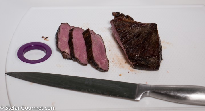 Then I sliced it thinly against the grain. I did try to include a bit of the fat cap by slicing on the diagonal, because at this point I had not yet realized that the fat cap wasn’t edible anyway.