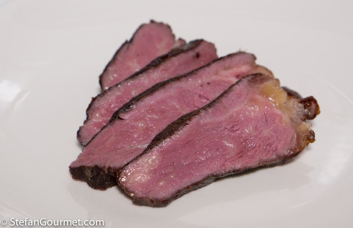 Usually I dry-rub marinate the meat for a couple of days under vacuum, wash and dry it and then sear it on all sides paying attention to the fatty areas. I then cook it sous vide at 60C/140F for 48-72 hours. The bag juices are reduced and used for serving. I usually just serve rectangular pieces of the cooked meet. The outside color is dark and inside it’s a beautiful pink.