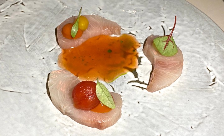 It was a good pairing with raw Lirio, a fish from the nearby coast, served with tomato, bell pepper, and gazpacho. The fish was impeccably fresh.