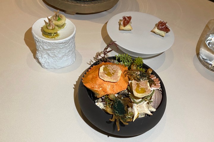 The amuse bouche were great: shrimp, dried tuna, crab toast, olive with pata negra…