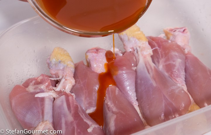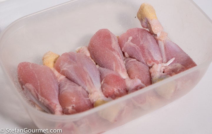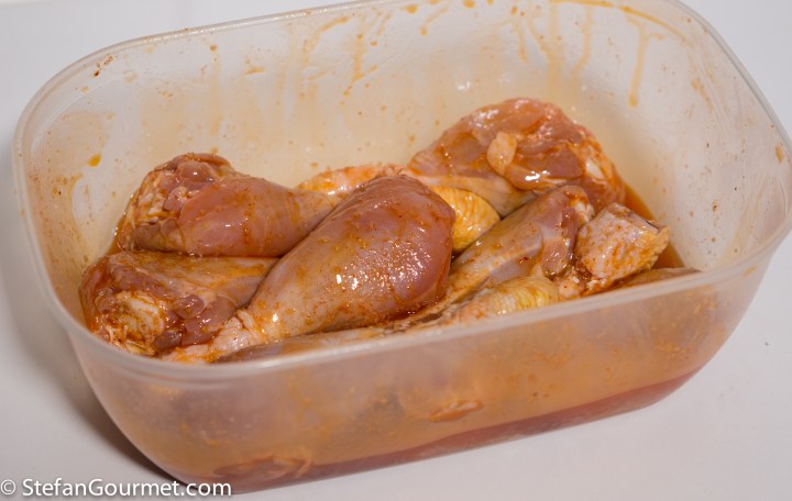 I took a supply of piri piri back home, and did some experimenting to recreate it at home. I decided to use drumsticks, to have less bones. Wings would also be excellent. Here’s what I came up with.
