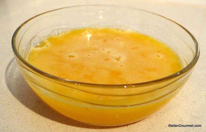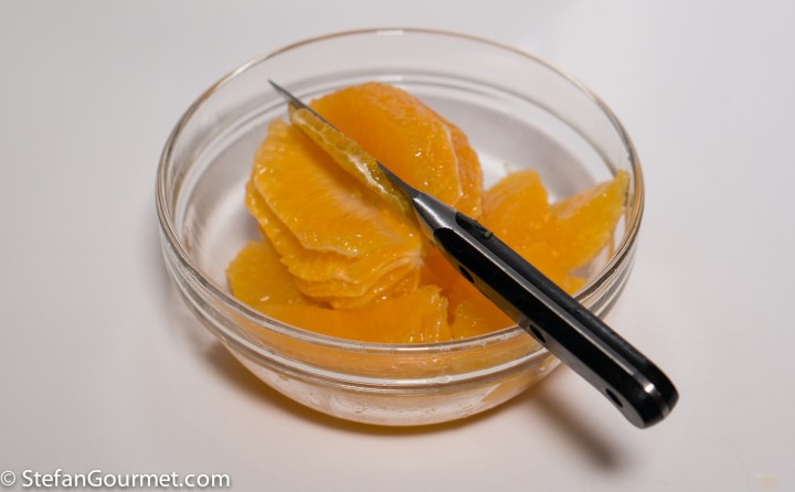 The only think you need to add is orange supremes. Orange supremes consist of only tender orange ‘flesh’ without chewy membranes or pith. First you peel the orange with a pairing knife, making sure to remove all of the white pith. Next you cut out the supremes from between the membranes, again with a sharp pairing knife, as shown in the photo.