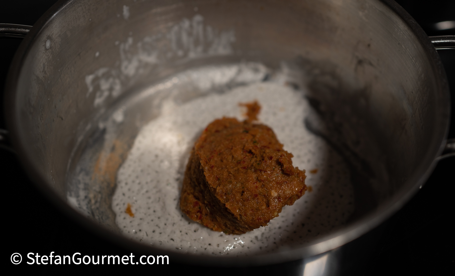 Stir for a couple of minutes over medium-high heat until the curry paste becomes very fragrant.