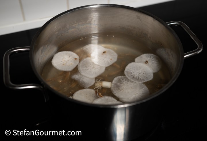 To make the anchovy stock, combine 1 litre of water with 50 grams of daikon, 25 grams of dried anchovies, and the roots of the 3 green onions in a saucepan.