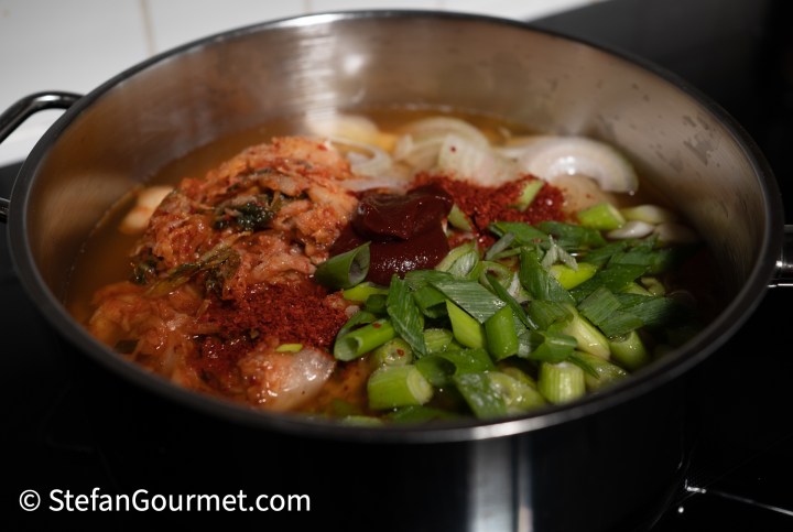 In a wide pan, combine 450 grams chopped kimchi, the anchovy stock, 60 ml kimchi brine, 2 chopped green onions, 1 chopped onion, 3/4 teaspoon table salt, 2 teaspoons sugar, 2 teaspoons Korean hot pepper flakes, 1 tablespoon Korean hot pepper paste, and 1 teaspoon toasted sesame oil.