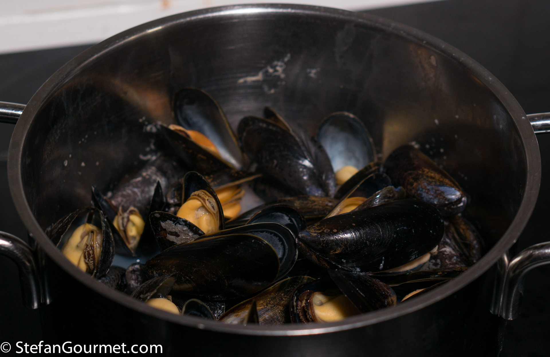While the shrimp stock is simmering, put the mussels in a pot with 125 ml (1/2 cup) of water. Cover and cook over high heat until the mussels have opened. Sieve the liquid. A sieve lined with kitchen paper is best to get rid of any sand.