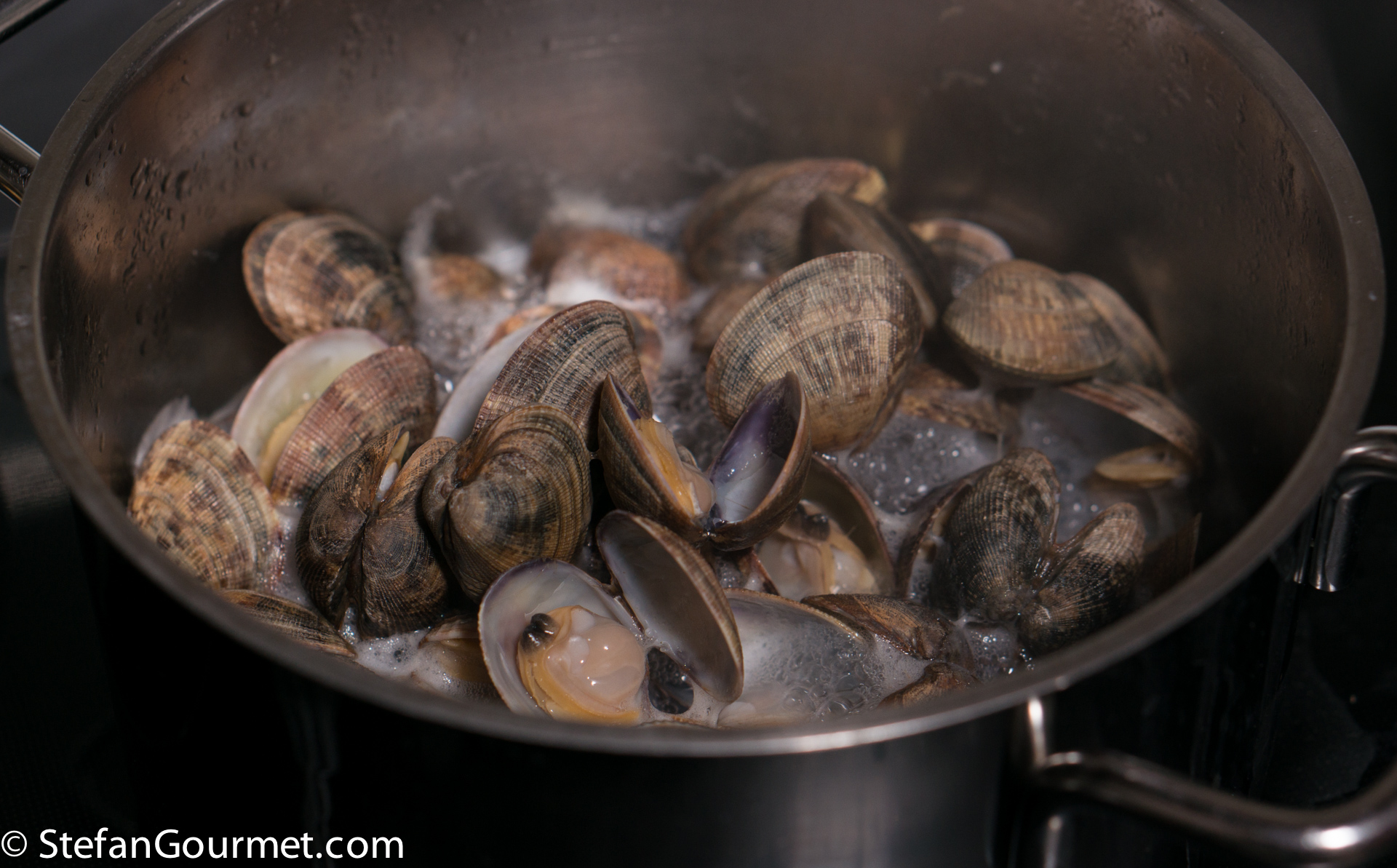 1/2 kilo (1 lb) vongole or other clams, which have been allowed to purge themselves in salted water (30 grams of salt per litre of water) for an hour