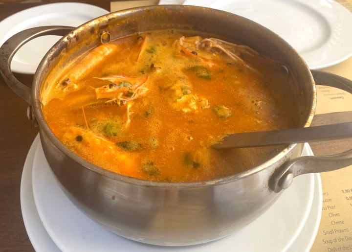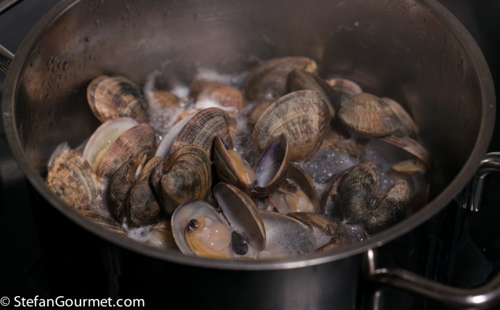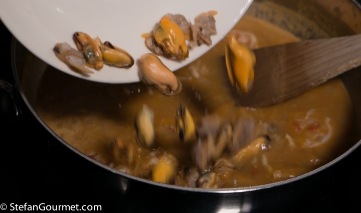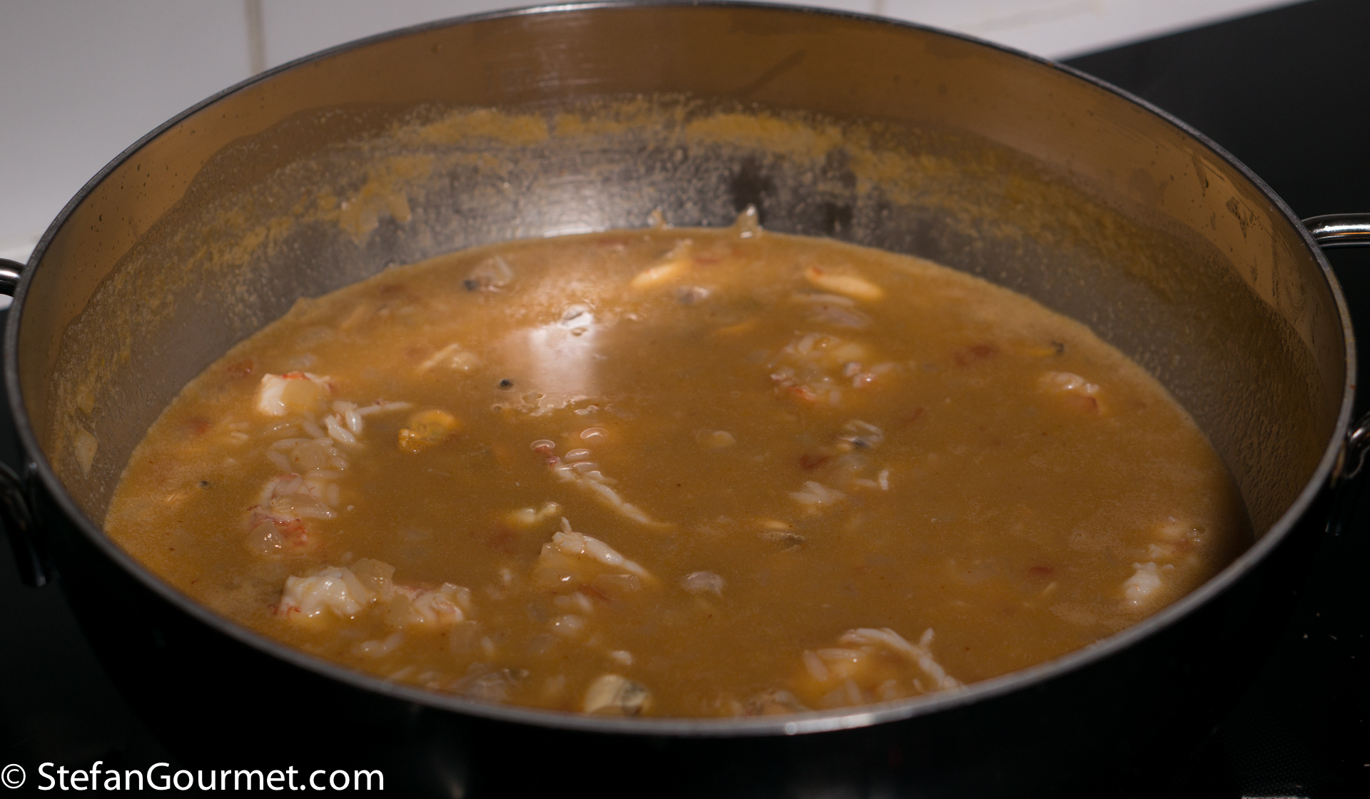 The delicious flavor comes mostly from the liquor that is released by the clams and mussels, and from the heads and shells of the shrimp. I couldn’t find any crab claws, so left them out. As with all recipes of this type, there are no fixed ingredients and you use what you have at hand. I used pink Argentinian shrimp, which are pink even when they’re raw.