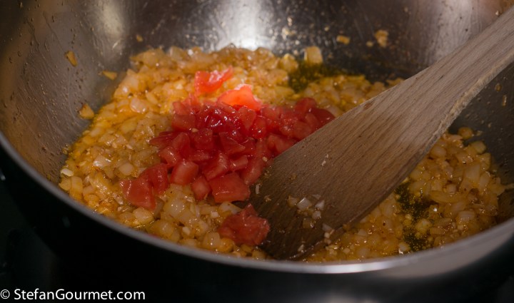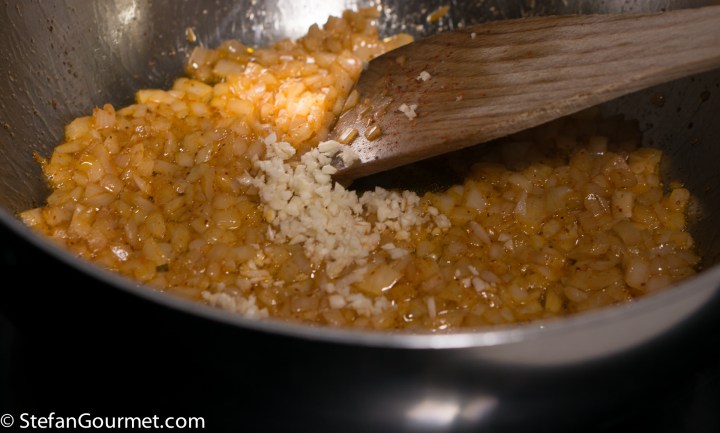 Heat the remaining 2 tablespoons of olive oil in a casserole or Dutch oven. Add a minced onion and stir over medium heat until the onion is golden.