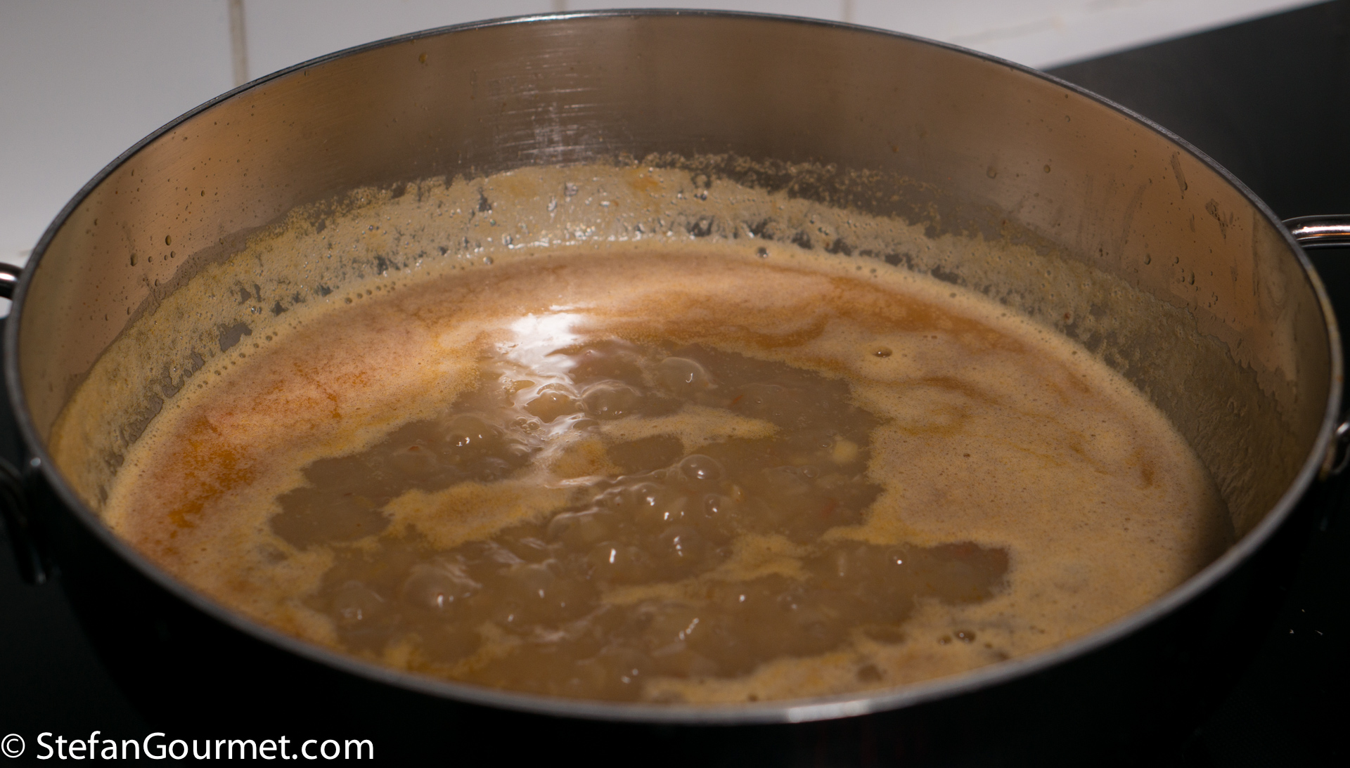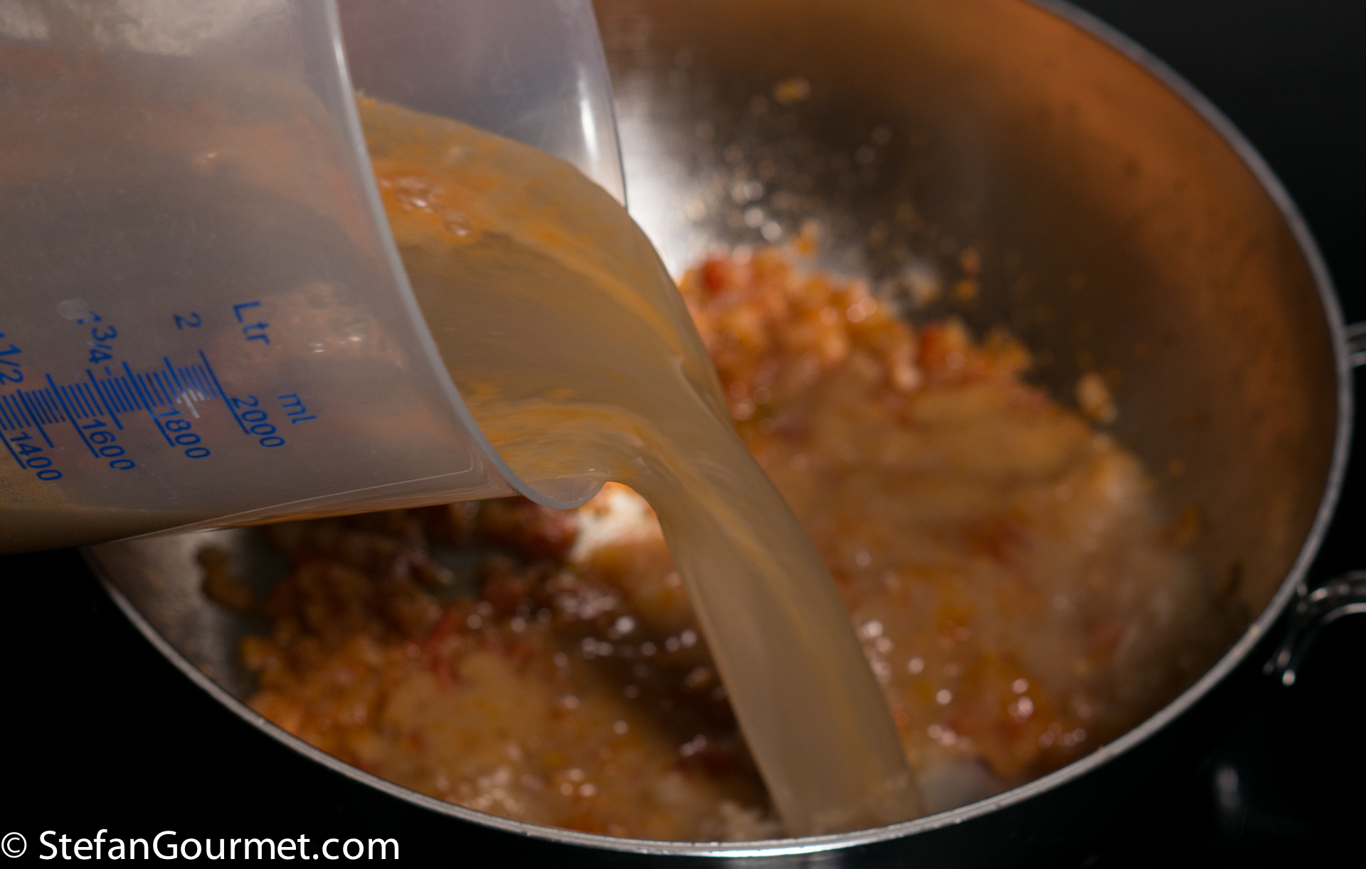 Deglaze with 125 ml white wine, and allow to evaporate by half to get rid of the alcohol. Scrape the bottom of the pot with a wooden spatula to get all the flavor into the soup.
