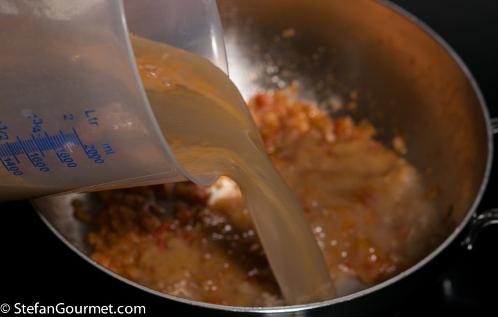 Combine the shrimp stock with the liquid from the mussels and clams. Add water if needed to end up with 1 litre (4 cups).