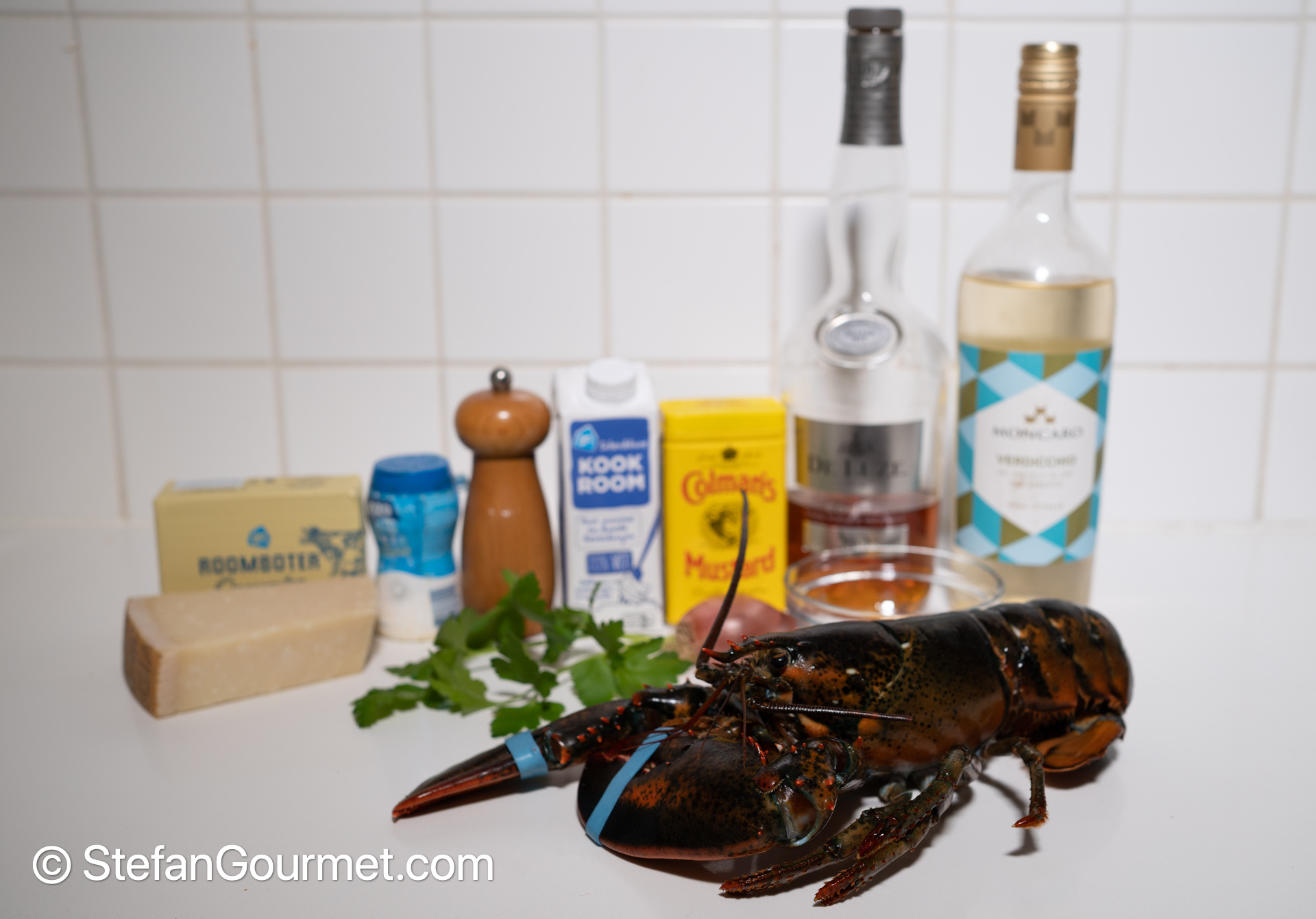 Lobster Thermidor is a classic French dish that I had not prepared before. Now I regret that, because it is really delicious and I will definitely make it again. As I am somewhat of an ‘adopted Italian’, I don’t tend to combine seafood with cheese. But in this case it definitely works, and the cheese doesn’t overpower the lobster. That is also because a modest amount of cheese is used. The dish was created in Paris in 1891 by the famous chef Auguste Escoffier. It consists of lobster meat served in its shell with a sauce and cheese gratin on top. As often with classic recipes there are some variations, such as using béchamel or cream, parmesan cheese or gruyère, including mushrooms or not, and the herbs and spices included.